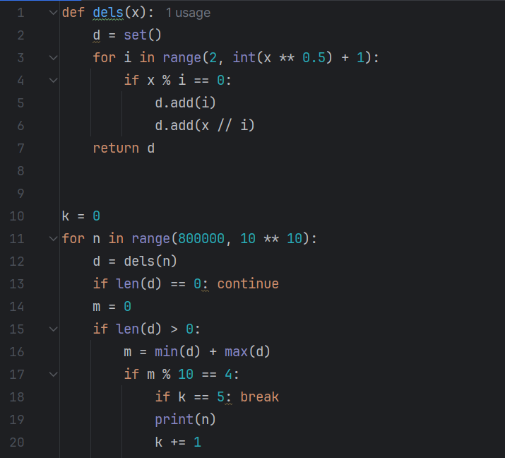 Пусть M – сумма минимального и максимального натуральных делителей целого числа, не считая единицы и самого числа. Если таких делителей у числа нет, то считаем значение M равным нулю. Напишите программу, которая перебирает целые числа, бо́льшие 800 000, в порядке возрастания и ищет среди них такие, для которых M оканчивается на 4. В ответе запишите в первом столбце таблицы первые пять найденных чисел в порядке возрастания, а во втором столбце – соответствующие им значения M. Например, для числа 20 М = 2 + 10 = 12. Количество строк в таблице для ответа избыточно. Ответ: Назовём маской числа последовательность цифр, в которой также могут встречаться следующие символы: Например, маске 123*4?5 соответствуют числа 123405 и 12300405. Среди натуральных чисел, не превышающих 10**10, найдите все числа, соответствующие маске 3?12?14*5, делящиеся на 1917 без остатка. В ответе запишите в первом столбце таблицы все найденные числа в порядке возрастания, а во втором столбце – соот