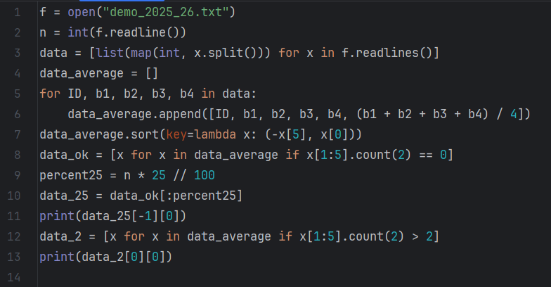 Во время сессии студенты сдают 4 экзамена, за каждый из которых можно получить от 2 до 5 баллов. Студенты, получившие хотя бы одну «двойку», считаются не сдавшими сессию. Результаты сессии публикуются в виде рейтингового списка, в котором сначала указаны идентификационные номера студентов (ID), сдавших сессию, в порядке убывания среднего балла за сессию, а в случае равенства средних баллов – в порядке возрастания ID. Затем располагаются ID студентов, не сдавших сессию: сначала – получивших одну «двойку», затем – две «двойки», потом ID студентов с тремя «двойками» и, наконец, ID студентов, получивших по 2 балла за каждый из экзаменов. Если студенты имеют одинаковое количество «двоек», то их ID в рейтинге располагаются в порядке возрастания. Повышенную стипендию получают студенты, занявшие в рейтинговом списке первые 25 % мест, при условии отсутствия у них «двоек». Гарантируется, что без «двоек» сессию сдали не менее 25 % студентов. Найдите ID студента, который занимает пос
