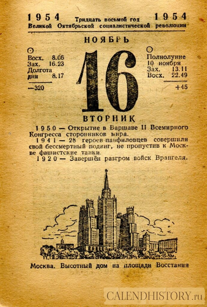 Итак, сегодня 16-го ноября и у нас на календаре 1954-й год. Перед нами листок советского календаря Политиздата. На календаре у нас вторник - 16 ноября 1954-го года. Москва. Высотный дом на площади Восстания 1950 — Открытие в Варшаве II Всемирного Конгресса сторонников мира. 1941 — 28 героев панфиловцев совершили свой бессмертный подвиг, не пропустив к Москве фашистские танки. 1920 — Завершён разгром войск Врангеля. *** Оборотную сторону листка этого календаря можно посмотреть у нас по ссылке на сайте. Другие листки советских календарей смотрите у нас на сайте - CALENDHISTORY.ru ПОСМОТРИТЕ ЕЩЁ ЛИСТКИ ОТРЫВНЫХ КАЛЕНДАРЕЙ: