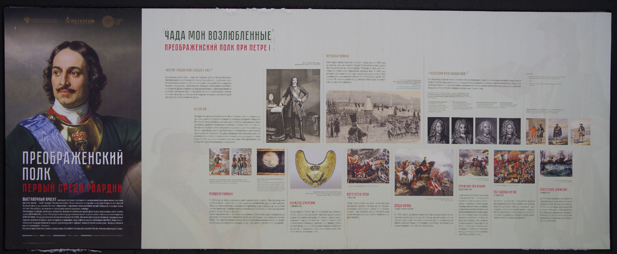 Выставочный проект «Преображенский полк – первый среди гвардии» посвящен истории старейшего пехотного полка в истории русской гвардии. Повествование об истории полка от зарождения при Петре I вплоть до 1917 года сопряжено с картинами повседневной жизни гвардейцев-преображенцев в Санкт-Петербурге, их участия в государственной, общественной и культурной жизни Северной столицы, а также в войнах, которые вела Российская империя. Стендовая выставка расположена в Нижнем парке у каскада «Шахматная гора». Проект выполнен в рамках программы «Россия, помнящая Петра» Ассамблеи петровских музеев России при поддержке Министерства культуры Российской Федерации. Участниками проекта выступили Государственный музей-заповедник «Петергоф», Государственный исторический музей, Военно-исторический музей артиллерии, инженерных войск и войск связи, Санкт-Петербургский государственный музей театрального и музыкального искусства, Московский государственный объединённый музей-заповедник, Переславский музей-запов