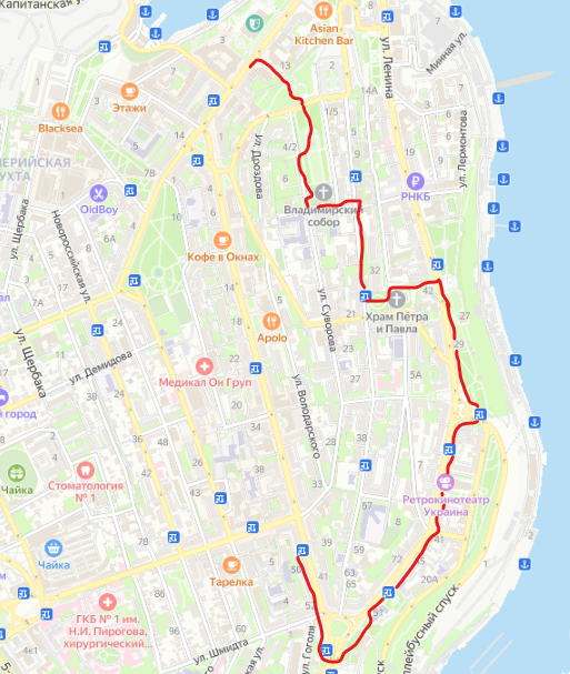 В этой статье погуляем по вечернему центру города. Увидим Матросский клуб, кинотеатр "Украина", Владимирский собор и памятник Ленину. Ну что, пойдем прогуляемся? Погода была не самой лучшей, долго я думала куда поехать, что поснимать и решила просто погулять по центру города. Вот мой маршрут на карте: Вышла на остановке "улица Большая Морская" и пошла в сторону площади Ушакова. Интересный декор у "Челентано", только я не совсем поняла для чего тут перевернутые корзинки: Качели на площади Ушакова: Летом здесь много людей, работает фонтан, бегают дети, катаются на качелях. Идем дальше, в сторону пешеходного перехода: Дорогу перешли и сразу видим информационную табличку: Владимирский собор мы с вами еще увидим в этой статье. На заднем плане видно забор, за ним находится Исторический бульвар, надеюсь, что скоро там закончится ремонт и я вам его покажу. Идем дальше и видим Матросский клуб: Напротив Матросского клуба находится библиотека имени Л.Н. Толстого: Здесь мне понравились фонари