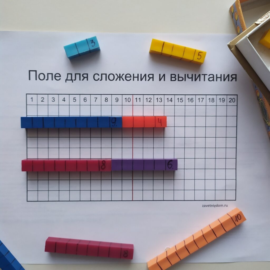 Классический Монтессори-материал по математике, который можно сделать из картона или палочек Кюизенера. Будет полезен старшим дошкольникам и младшим школьникам. Как научить ребенка считать (складывать и вычитать)? Есть много интересных игр и приемов. Мне нравятся наглядные. Например, в системе Монтессори есть такой материал: пластиковая доска, разделенная на квадраты, сверху написаны числа от 1 до 20 и полоски разной длины от 1 до 10. Как это работает: Нужно решить пример 4+5. Берем полоску 4, выкладываем на поле, приставляем к концу этой полоски полоску 5. Смотрим, какой длины получилась наша полоска. Пример решен. Похожее пособие есть в программе РКШ по математике для 1 класса. Покупать такие готовые пособия для дома довольно дорого. Между тем их можно легко сделать из подручных материалов. Например, из картона. А если у вас есть счетные палочки Кюизенера, то получится долговечное пособие, которое послужит долго. Берем из набора по две палочки каждой длины. Перманентным маркером дел