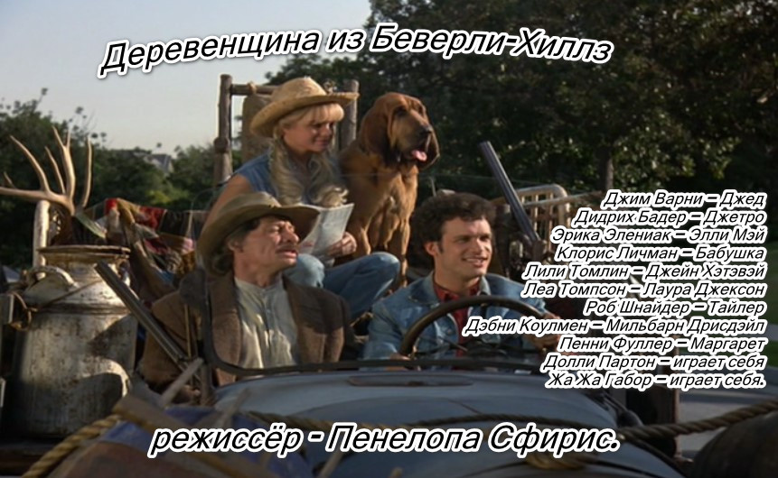 Здравствуйте, друзья. Когда я добросовестно занимался видео-пиратством мне попалась кассета с фильмом «Деревенщина из Беверли-Хиллз». И всё, с тех пор, а это было начало 90х, я этот фильм смотрел миллион раз. И буду ещё смотреть и смотреть. Сюжет не замысловатый. Фильм про везунчиков. Если у вас на даче будет бить нефтяной фонтан — вам повезло. Вот и семье главного героя повезло. Теперь они богатые…. Можно и почудить. Переезжают по новому адресу, где спокойная жизнь заканчивается и начинается светская. Фильм вышел в 1993 году. Режиссёр - Пенелопа Сфирис. Список очень главных ролей и артистов - Джим Варни — Джед Дидрих Бадер — Джетро Эрика Элениак — Элли Мэй Клорис Личман — Бабушка Лили Томлин — Джейн Хэтэвэй Леа Томпсон — Лаура Джексон Роб Шнайдер — Тайлер Дэбни Коулмен — Мильбарн Дрисдэйл Пенни Фуллер — Маргарет Долли Партон — играет себя Жа Жа Габор — играет себя. Переходим по ссылке и смотрим. Благодарю за внимание. Пока. - The Beverly Hillbillies (Пенелопа Сфирис Penelope Spheer