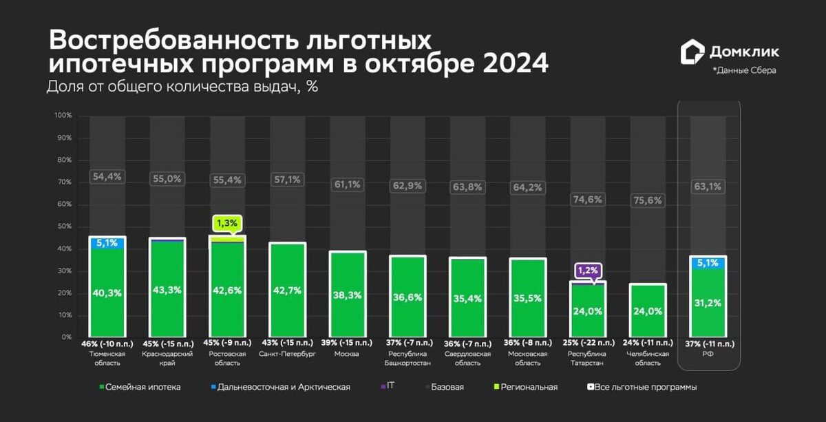 🔸Количество выдач по льготным ипотечным программам в общей структуре выдачи Сбера снизилась более чем на 21% за октябрь, до 18,7 тыс. сделок; 🔸Количество сделок за месяц в рамках «Семейной ипотеки» составило 15,8 тыс. Это на 23,1% меньше, чем в августе, и на 18,7% — чем в сентябре. На программу приходится 31,2% от общего количества ипотечных выдач Сбера и 81% от общего количества ипотечных сделок в сегменте первичного жилья; 🔸В октябре также наблюдалось сокращение спроса на «Арктическую и Дальневосточную ипотеку». Количество выдач по программе составило 2,6 тыс., что на 25,4% ниже, чем в сентябре. При этом доля выдач по программе также снизилась — на 1,9 п.п., до 5,1%; 🔸Спрос на другие льготные ипотечные программы - IT-ипотека, «Региональная ипотека» – суммарно в октябре пришлось около 0,5% всех выдач Сбера.