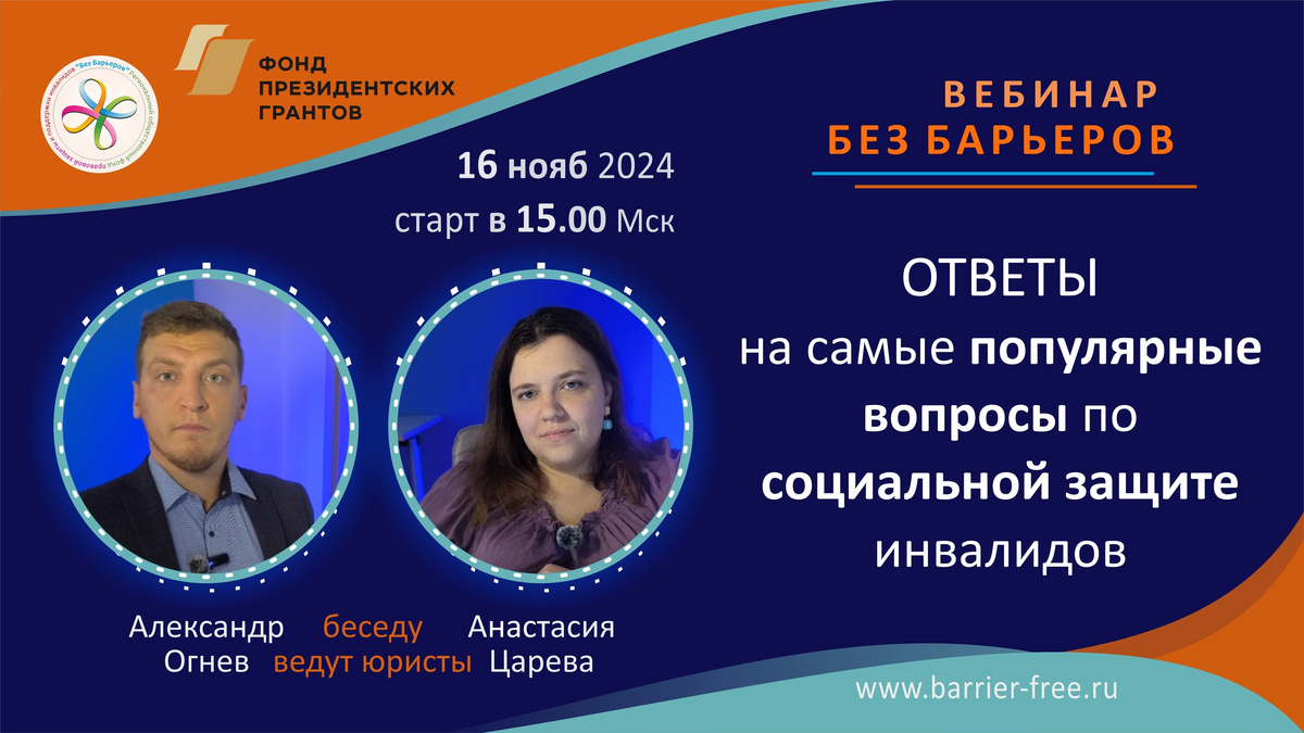 Кто прошел регистрацию - встречаемся на платформе Яндекс.Телемост Продолжайте следить за нашими анонсами! Проект реализуется при поддержке Фонда Президентских грантов целевая #помощь юристам barrier-free.ru/campaign/donat #безбарьеров #юристы #barrierfreeru #инвалид #право #бесплатно #консультация #фондбезбарьеров #вебинар #социальнаязащита