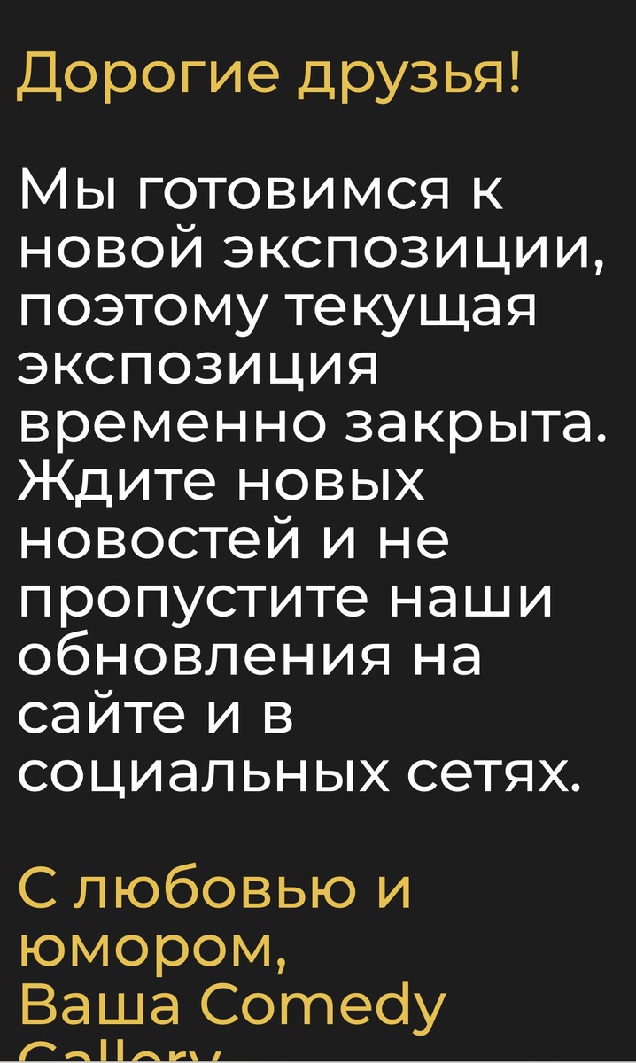 Вы когда-нибудь ходили в галерею посмеяться? Я да, как раз в той самой Camedy Gallery на малом левшинском переулке. Как всегда перед написание статьи, я проверила работает ли данная выставка. На официальном сайте информация такая: Сейчас я покажу то, что я видела в начале 2022 года. Экспозиции выставки впечатляющие - и задумывалась о грядущем, и смеялась. Самих экспозиций не так много: полчаса просмотра и уже ты одеваешься на выход. За вход мы заплатили по-моему рублей 700-800, я считаю, что цена завышена за такое количество экспонатов. Одна из экспозиций, которая вроде бы адекватная, но нужно читать описание: Читала отзывы на выставку, определенно могу сказать, что сходить и сделать свой отзыв будет самым правильным, ибо те, кто смотрел камеди клаб - смешно, тем, кто нашел шоу не смешным - там делать нечего.