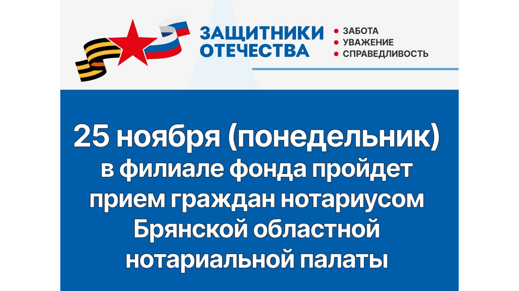 На площадке Брянского филиала фонда «Защитники Отечества» на постоянной основе проходят бесплатные консультативные приемы для участников и ветеранов СВО, членов их семей. Очередной запланирован на 25 ноября. С 11:00 до 13:00 часов его проведет нотариус нотариальной палаты Брянской области Роман Лопатин. В рамках оказания бесплатной юридической помощи он проведет правовое консультирование по вопросам нотариальной деятельности: о необходимости составления завещания, о порядке и очередности наследования, о распоряжении совместной собственностью, составлении и расторжении брачного договора, уплате алиментов на содержание несовершеннолетних детей и других. Кроме того, Роман Лопатин расскажет об удостоверении доверенностей на представление интересов граждан в судах, государственных и муниципальных органах, организациях. Так, для получения на безвозмездной основе услуги по удостоверению доверенности гражданином нотариусу должно быть представлено соглашение, заключенное с адвокатом либо с госу