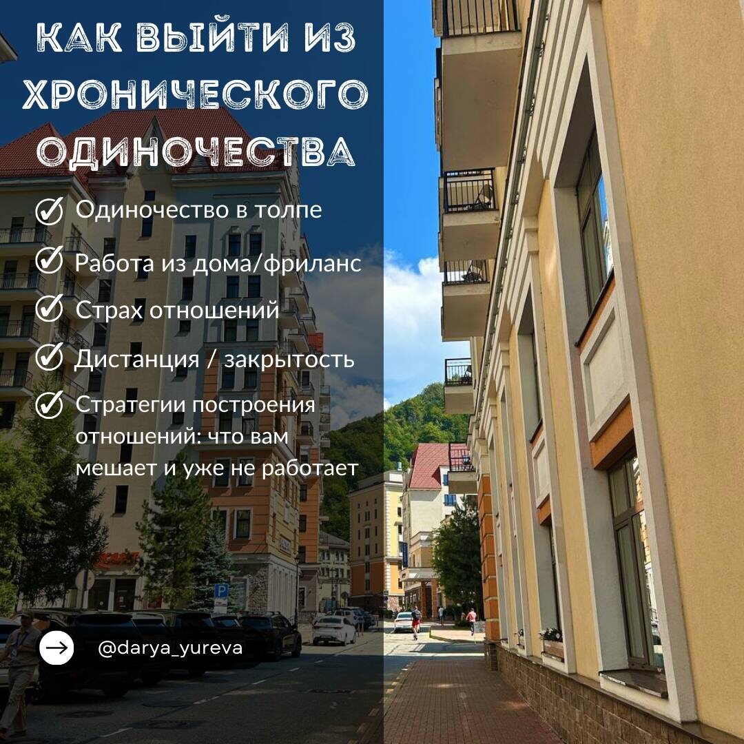 Регулярная терапия - это точка выхода из хронического внутреннего или внешнего одиночества. Из сценариев, когда: