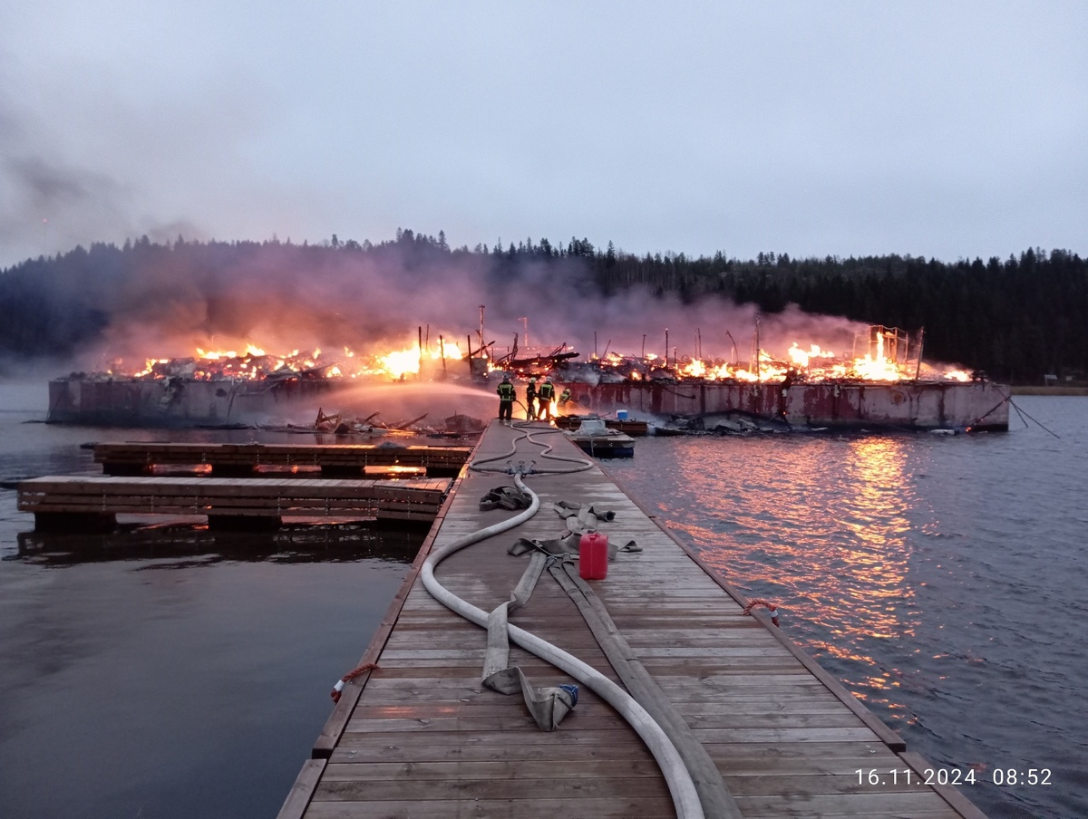 Огонь быстро распространился по всей площади здания. О том, что осложняло тушить пожар в плавающей гостинице в Приладожье, рассказали огнеборцы 38 пожарно-спасательной части Сортавалы. В паблике появились и новые кадры с места пожара. Так, 16 ноября в 06.57 на пульт диспетчера пожарной охраны поступило сообщение о возгорании строящейся плавучей гостиницы в Фанерном тупике в Сортавале. На место был направлен личный состав 38 ПСЧ Сортавалы и поселка Хелюля. Прибывшие пожарные выяснили, что горит здание в заливе, куда подойти можно только по мосткам. Осложнялось тушение сильным ветром, а также нахождением газовых баллонов в помещениях здания, которые стали взрываться. Огонь быстро распространился по всей площади здания. Также загорелось маломерное судно, припаркованное с другой стороны. Горящее судно прибило к противоположному берегу, его потушили с катера спасателей. Пострадавших нет, причина пожара устанавливается. Напомним, по предварительной информации, огнём повреждены 450 квадратн
