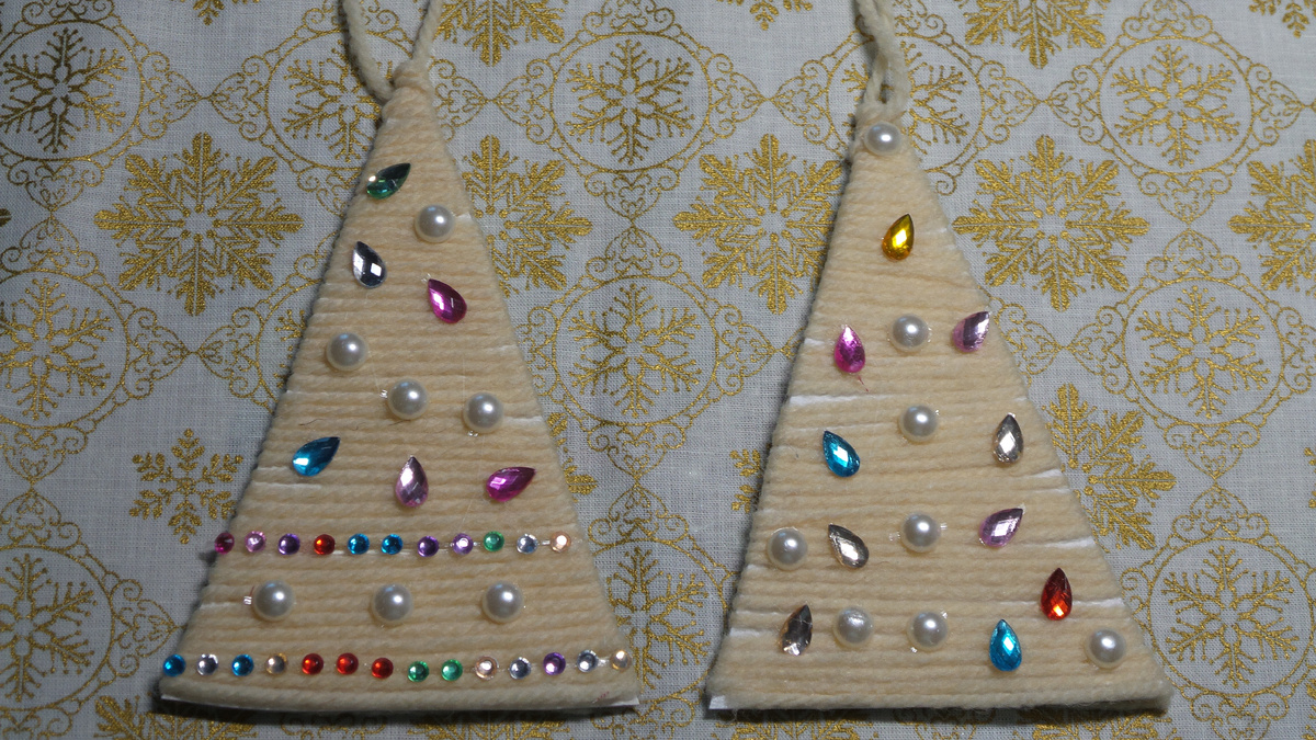 Вырезаете шаблон елочки в форме треугольника, и намазав клеем (я использую клей карандаш), приклеиваете бечевку и украшения. В качестве декора елочки можно использовать любые декоративные элементы.