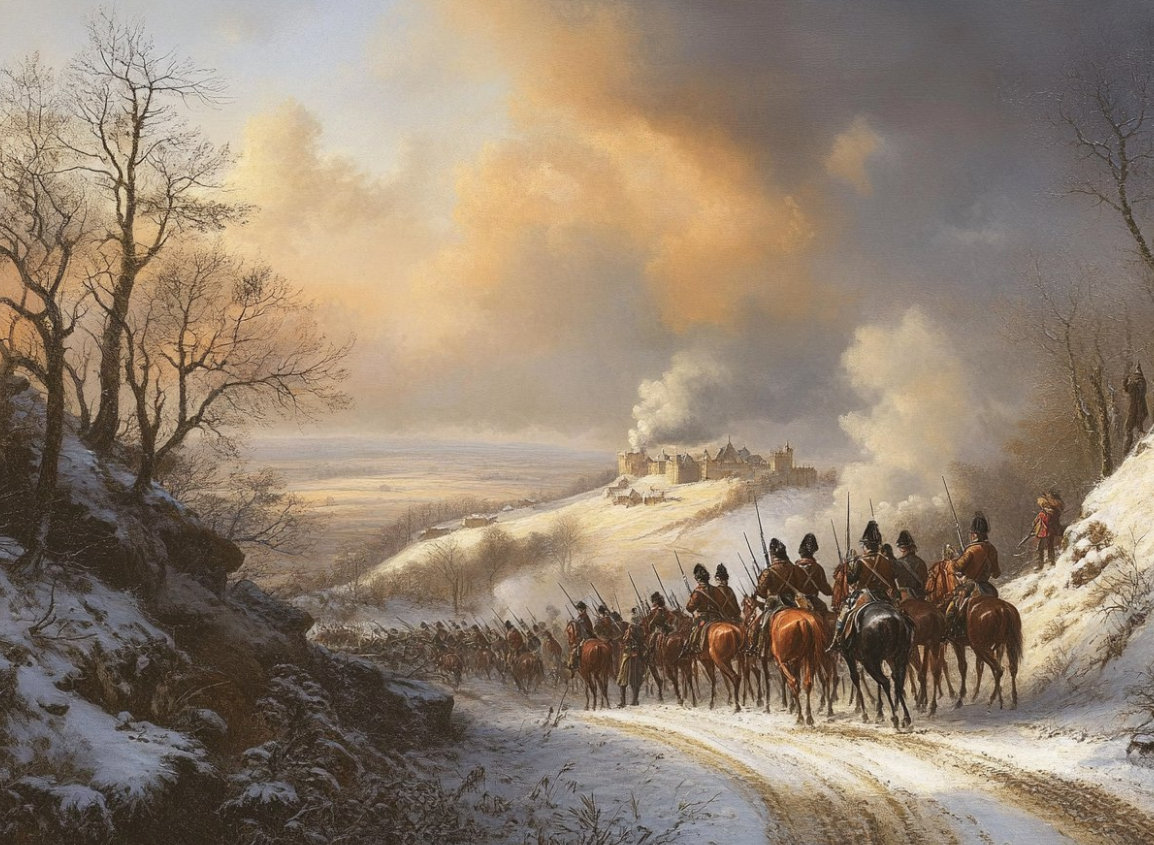 Теперь уже не только всадники, но и пехота с мушкетами.