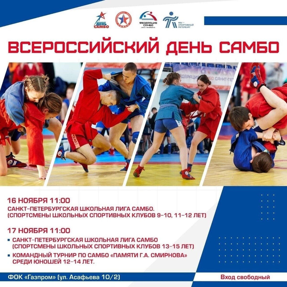 В Северной столице пройдет ряд спортивных турниров, посвященных Всероссийскому дню самбо, который отмечается 16 ноября. Об этом сообщает Комитет по физической культуре и спорту Санкт-Петербурга. Так, 16 и 17 ноября на площадке комплекса «Газпром» пройдут соревнования Санкт-Петербургской школьной лиги самбо. В первый день за призовые места будут соревноваться дети в возрасте от 9 до 12 лет. Они продемонстрируют техники единоборства, а также поучаствуют в викторине и эстафете по самбо. Во второй день пройдут спарринг-поединки по спортивному самбо между школьниками от 13 до 15 лет. Кроме того, 17 ноября в комплексе «Газпром» также состоится командный турнир для юношей от 12 до 14 лет. Ранее сообщалось, что в Петербурге пройдет очередной этап Кубка губернатора по триатлону в помещении.