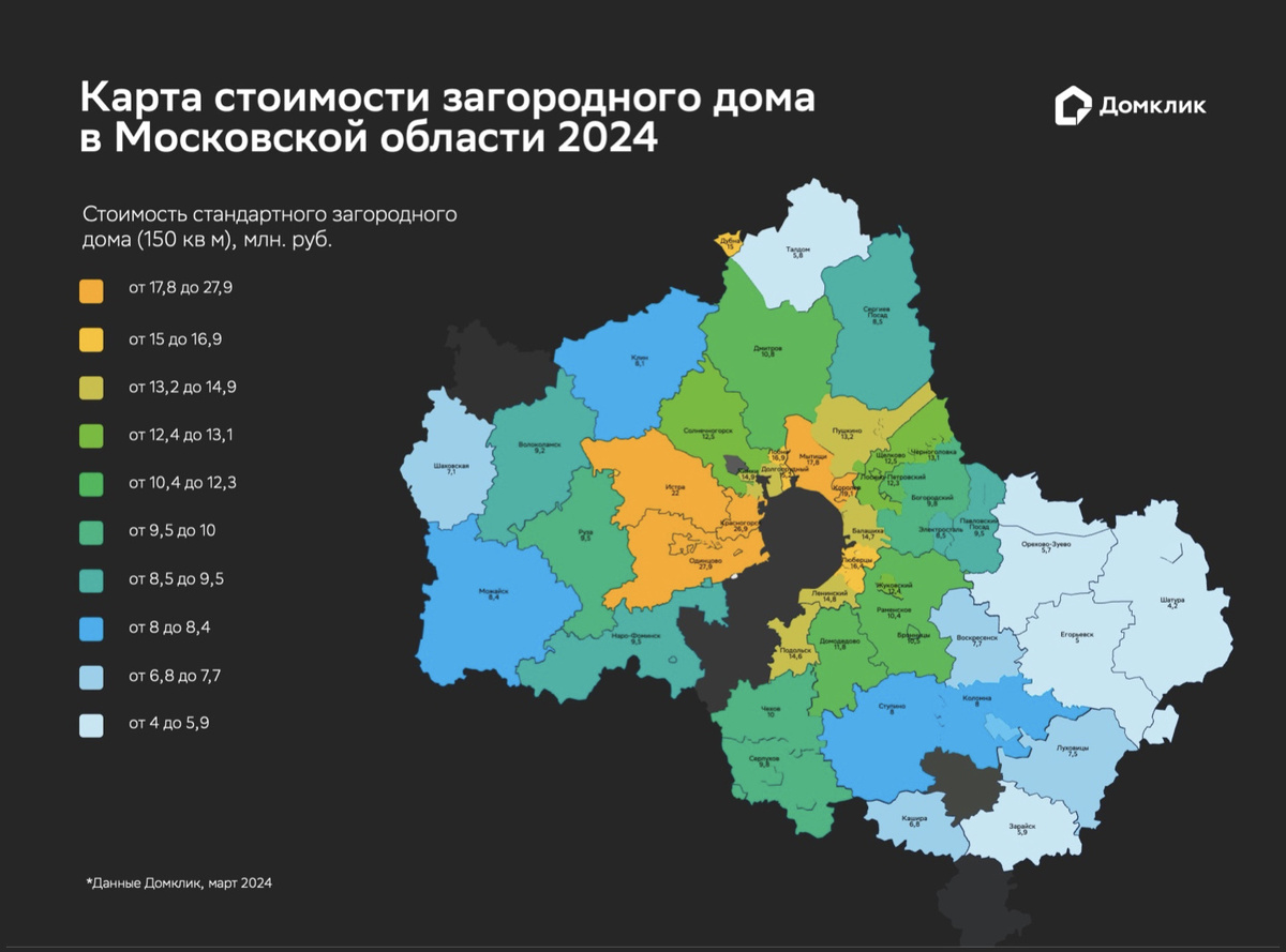 Аналитический центр Домклик провел исследование рынка загородной недвижимости в Московской области, в рамках которого были проанализированы цены на стандартные частные дома. Эксперты также рассмотрели изменения, которые произошли на рынке за последний год, и выделили основные тенденции, которые следует учитывать при выборе загородной недвижимости. Согласно результатам исследования, самые дорогие дома располагаются на западе от Москвы, особенно в городах Одинцово, Красногорск и Истра. Стоимость загородного дома площадью 150 квадратных метров в этих городах составляет 28 миллионов, 27 миллионов и 22 миллиона рублей соответственно. На севере и северо-востоке Московской области также представлено значительное количество элитной загородной недвижимости. В топ-10 вошли сразу шесть городов: Королев (19 миллионов рублей), Мытищи (18 миллионов), Лобня (17 миллионов), а также Долгопрудный, Дубна и Химки (по 15 миллионов). Третье направление с самой дорогой недвижимостью находится на юго-востоке