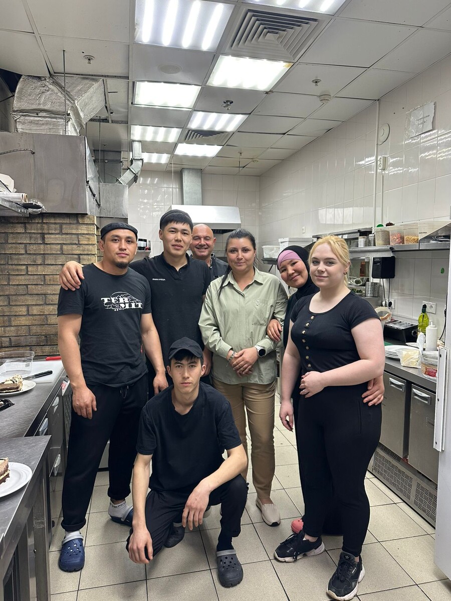 Это их поучение, кстати, принимало порой очень даже кривые формы. Например, я стою и делаю хачапури, народу в ресторане полно. И тут вдруг девушка киргизка Фарида (на фото вторая справа) срывается со своего места, где она делает салаты, подбегает ко мне и начинает мне вдруг показывать, как нужно убирать своё рабочее место. Возит от души тряпкой и при этом что то сердито бормочет по- киргизски. А у меня в это момент куча заказов! Целый ворох чеков болтается на чековой прищепке! А я стою и терпеливо жду, пока Фарида удовлетворит свой педагогический раж. Не будешь же сразу портить отношения с коллегами по работе.