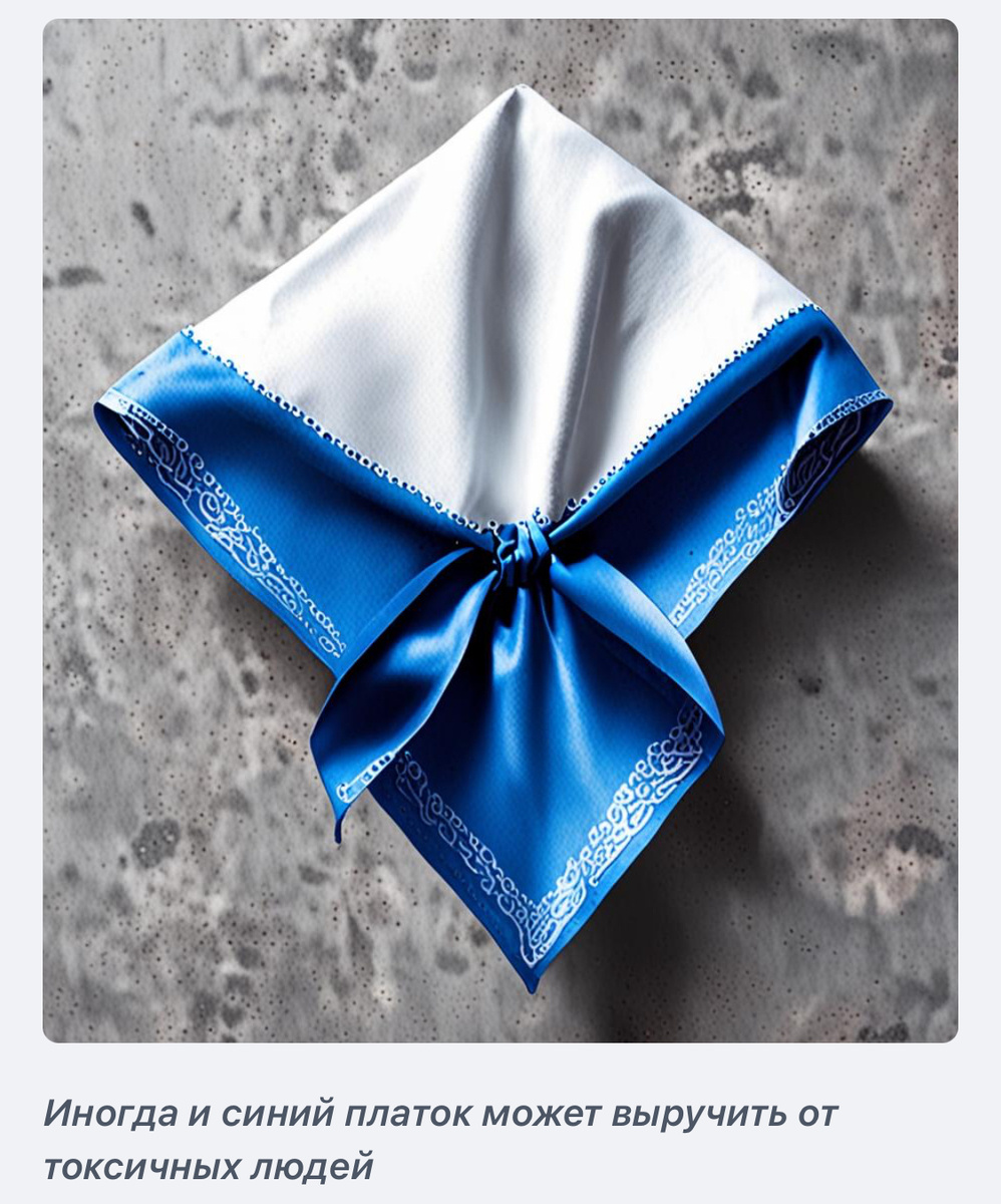💙💙💙Вот как только! Такие разговоры начинаются… переключите свой взгляд на предмет подальше от токсичного собеседника. 💙💙💙Отлично подойдет синий 💙 носовой платок, сосредоточьте на нем взгляд, так будет проще отвлечься от бреда Токсика.