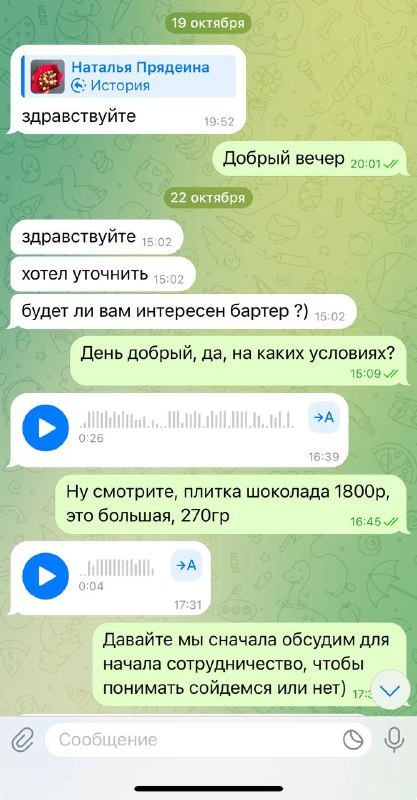 И тут он мне пишет: сделайте 2 (!) шоколадки - одну, которую были должны и 1 на будущее на следующее посещение. Учитывая, что мне максимально с ним неприятно было разговаривать, я неоднократно просила его не общаться со мной голосовыми, меня не слышали и данное посещение было последним, он просит еще 1 плитку за 1800р на следующее посещение.
