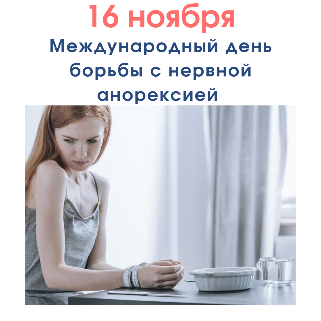 Ежегодно 16 ноября, начиная с 2005 года, отмечается Международный день борьбы с анорексией. Основная цель проведения данного мероприятия - привлечь внимание общественности к проблеме анорексии, заболевания, которому на сегодняшний день все чаще подвергаются все большее количество людей, в том числе несовершеннолетние девушки и юноши. Нервная анорексия - это серьезное психическое расстройство, характеризующееся болезненной тягой к снижению веса, страхом перед набором веса и искаженным восприятием своего тела. Ранее считалось, что анорексии подведены только женщины, но в последнее время это заболевание начинает распространятся среди несовершеннолетних девушек и юношей. Статистика очень неутешительна: анорексия - третье из самых распространенных хронических заболеваний у подростков. Анорексия- занимает лидирующие место среди психических заболеваний по смертности. Поэтому очень важно говорить об этом заболевании, знать признаки, понимать как и чем можно помочь, куда обратиться за помо