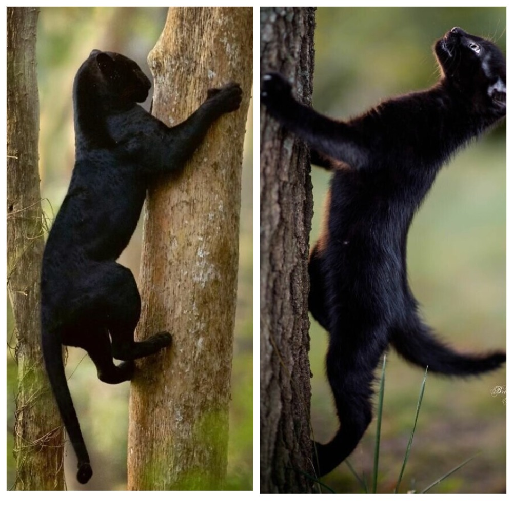 Рассмотрим фотографии этих красоток и расскажем немного об общих особенностях. Кошкам не занимать ловкости и физической силы у пантер. Оба представителя не прочь понаблюдать за миром свысока в этом им помогают крепкие и длинные когти. Они сохраняют бесстрашие перед различными преградами. Правда, пантеры более терпимо относятся к воде, чего не скажешь о кошках. Клыкастые хищники отлично справляются с разделыванием добычи. Иногда свои зубы они используют не по назначению, а для демонстрации мощи перед человеком. Охотничьи инстинкты проявляют домашние и дикие кошачьи. Отличный слух и зрение позволяют им учуять свою жертву и незаметно к ней подкрасться. Когда котики и пантеры сыты, они не прочь поваляться без дела. Они умны и знают, что только хорошо отдохнув, можно ловко справляться со своими обязанностями. Грацию и не