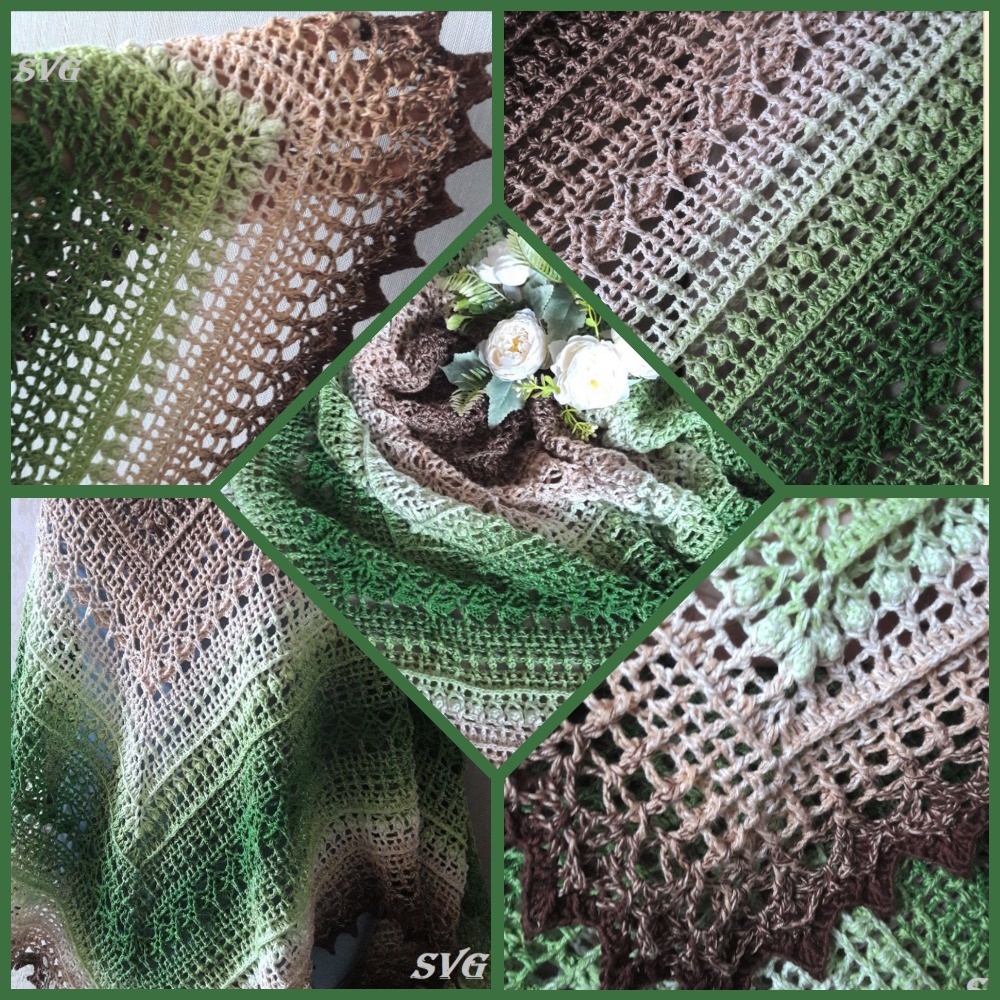 Всем заглянувшим доброго дня! В последнее время у меня совсем не получается вязать, по-этому я так редко появляюсь и чем-то делюсь. Показывать в общем-то нечего. Что получилось сотворить - это новую шаль крючком. Вязала из пряжи FLOWERS YARNART цвет № 272 (полухлопок градиент 250 г/1000 м) Крючок № 3,5 Расход 2 мотка (остаток несколько метров) Размер 200 по верхнему краю и 110 по центральной линии Сначала придумала панель узоров, ве это "вписала" в треугольник, а потом уже легче, повторять связанное, и некая кайма получилась Несколько фото процесса Обычно я делаю упор на рельеф. Этот раз не исключение, в каждом ряду присутствуют рельефные элементы Вот так выглядит до ВТО Обязательная блокировка после стирки 2000 метров превратились в полноценную шаль, которой можно и укрыться, набросив на плечи, и использовать в качестве бактуса. Размер позволяет применять, как пожелается Всем удачи!