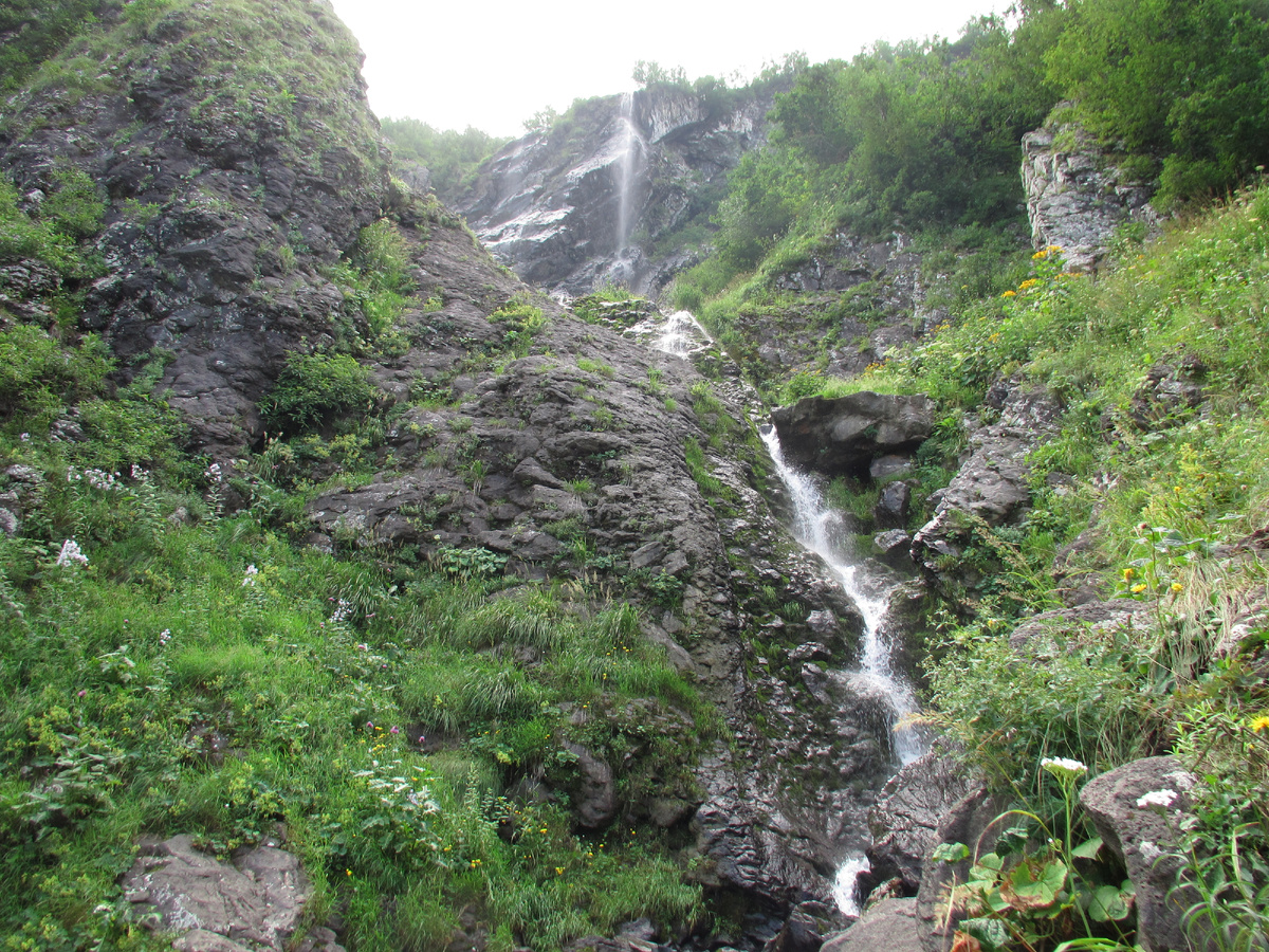 У водопада Поликаря мы были в августе. Тогда потоки водопада были совсем не бурными. Только в мае и июне водопад Поликаря бывает полноводным, поскольку он питается за счёт талых вод и осадков, выпадающих на хребте Аибга. К концу жаркого лета водопад Поликаря становится похож на горный ручей, зато он никогда не пересыхает. Фактически водопад Поликаря и образуется от ручья с названием Ржаной. Этот ручей - самый крупный водоток на склонах горного курорта Красная Поляна. В полноводный сезон бурный поток водопада делится выступом скалы на два водных рукава, в связи с чем местные шутники сочинили поговорку: "Поликаревы штаны во все стороны равны". Название самого водопада в переводе с греческого означает «богатырь». Богатырским водопад назвали, вероятно, за его размеры - высота водопада Поликаря - 72 метра. Расположен водопад Поликаря в живописном ущелье, в которое ведёт пешеходная тропа от конечной восточной станции канатной дороги горного курорта Красная Поляна. Сеть канатных дорог куро