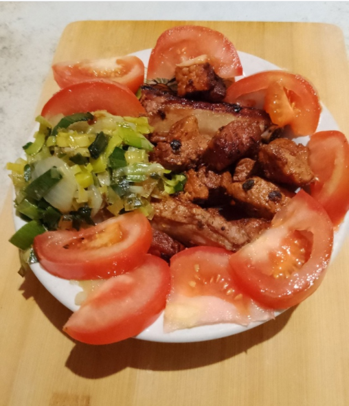 Чтобы создать кулинарный шедевр не нужно быть шеф-поваром, достаточно любить покушать, и тогда руки сами потянутся к продуктам, а фантазия оформит блюдо таким образом, чтобы даже его фотография выглядела аппетитно. Сегодня будем готовить мясо (свинина) с овощами. Рецепт чисто взял из своей головы, но получилось очень вкусно. И так, берём карбонат, грамм 500-700 и маринуем. Маринад изготавливаем таким образом: 50 мл. соевого соуса, щепотка сладкой паприки, щепотка чёрного перца молотого, щепотка сушёного болгарского сладкого перца. Всё это смешиваем с мясом и солим. Важно! Солим нитритной солью, грамм 5 берём. Тогда мясо приобретёт красивый оттенок, который не потеряет при жарке. Маринуем около одного часа. Далее разогреваем сковороду. Тем временем режем лук порей кольцами и половину крупной головки репчатого лука. Овощи обжариваем на растительном масле с добавлением сливочного масла. Луч обжариваем до слегка золотистой корочки. Вынимаем его в отдельную тару, в сковороду добавляем ра