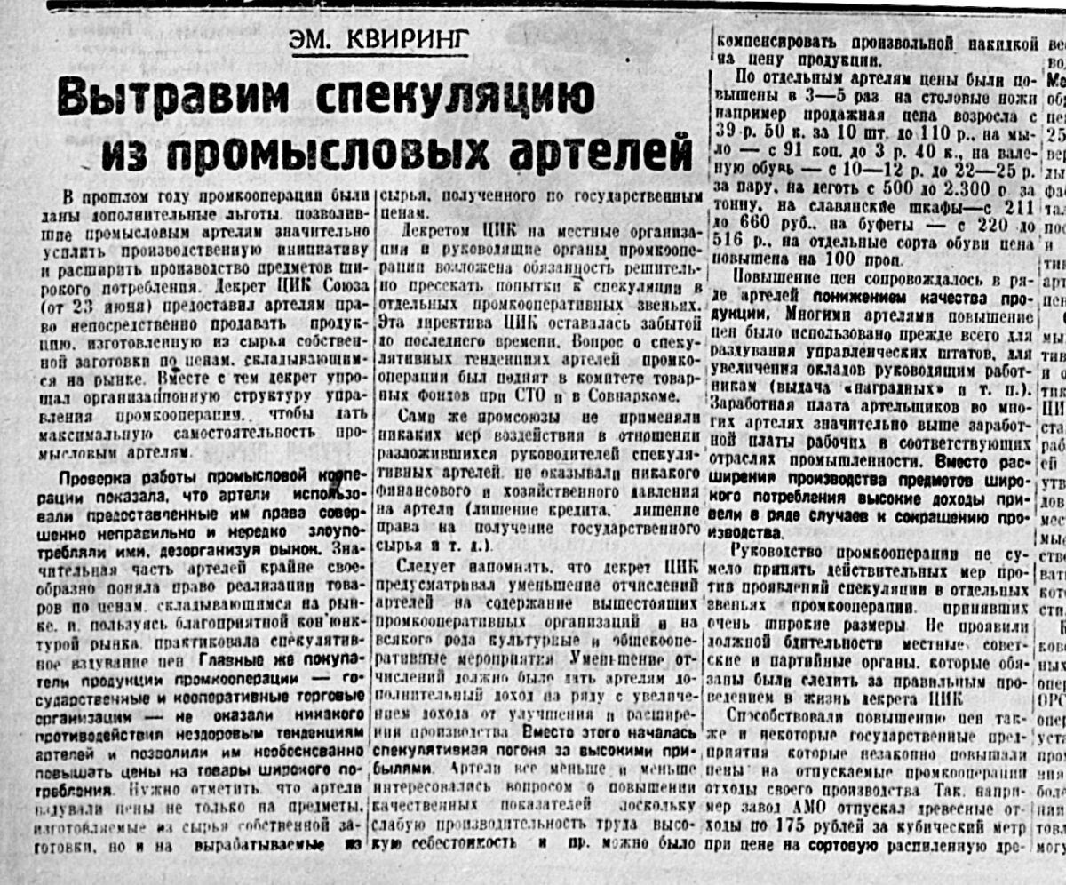 «По отдельным артелям цены были повышены в 3-5 раз, на столовые ножи например продажная цена возросла с 39 р. 50 к. за 10 шт. до 110 р., на мыло — с 91 коп. до 3 р. 40 к., на валеную обувь — с 10—12 р. до 22—25 р. за пару, на деготь с 500 до 2.300 р. за тонну, на славянские шкафы-с 211 до 660 руб., на буфеты — с 220 до 516 р., на отдельные сорта обуви цена повышена на 100 проц.