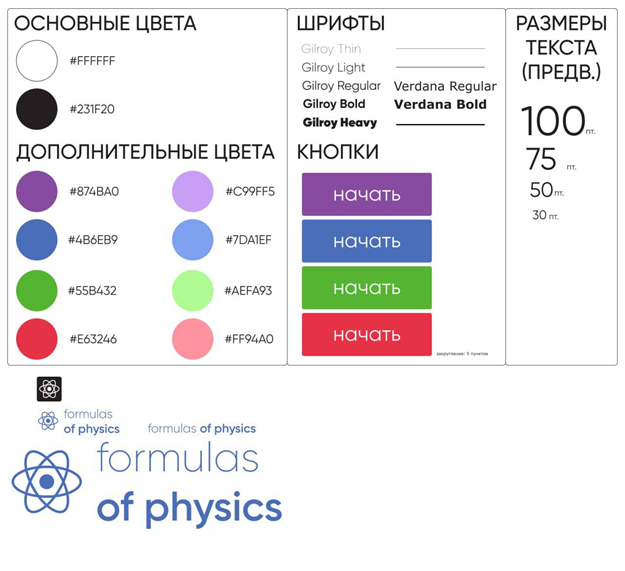 Команда проекта «Сайт для запоминания формул» Московского политехнического университета представляет собой 3 подгруппы по сферам: дизайн, front end, back end. Каждый участник проекта должен был определиться с тем, какую работу он будет выполнять согласно установленному руководителем каждой группы дедлайну. Работа дизайнеров Первыми работу над проектом начали дизайнеры, их задачей была разработка структуры и дизайна сайта, который будет не только функциональным, но и приятным для восприятия. Основной задачей было разработать стиль, который будет поддерживать академическую атмосферу, но при этом выглядеть современно и привлекательно для студентов. Для этого дизайнеры выбрали несколько ключевых направлений работы: цветовая палитра, выбор шрифтов, стиль и расположение кнопок, а также общий вид сайта, который должен соответствовать брендингу Московского политеха. Цветовая палитра На основе фирменного стиля университета были выбраны основные цвета — черный и белый, чтобы подчеркнуть лаконичн