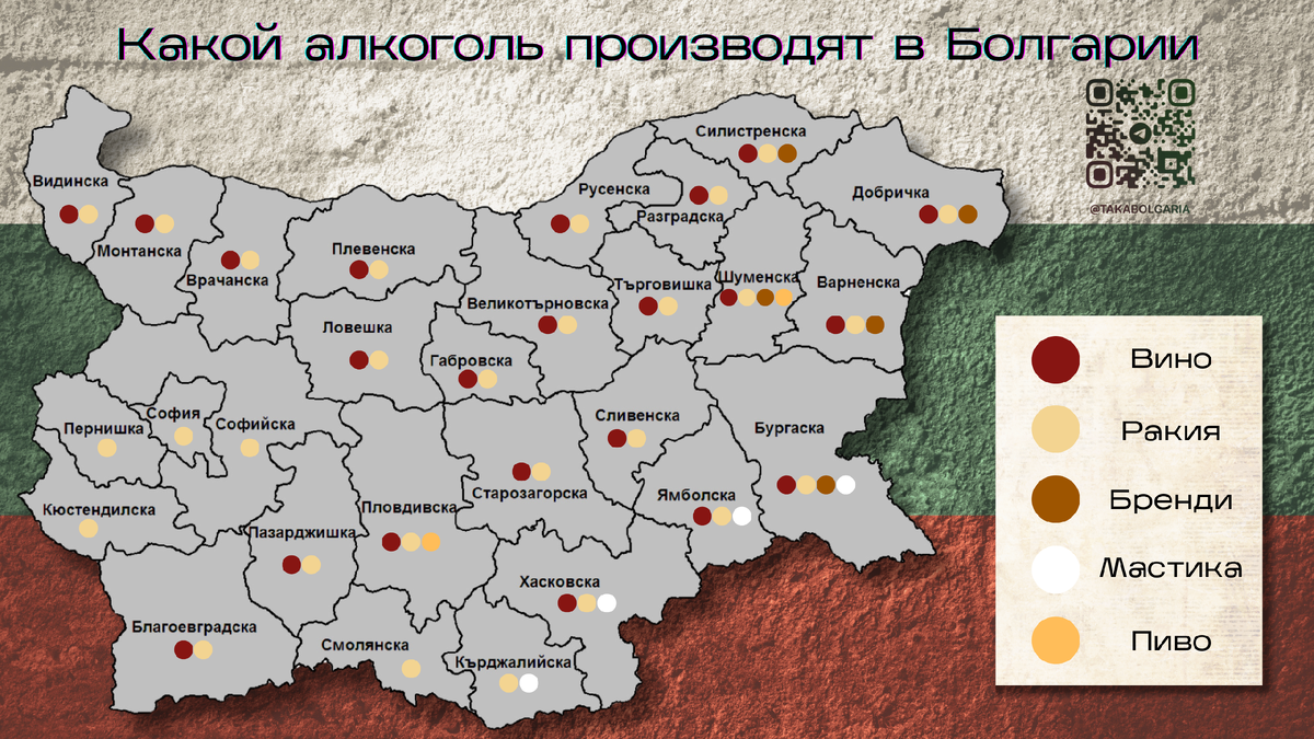 Ракия, известная на Балканах с XIV века, остаётся любимым напитком местных жителей. Содержание спирта в ней варьируется от 35% до 70%, а среди болгар распространено мнение, что ракия полезна для здоровья: она помогает предотвратить простуды и улучшает пищеварение. Часто её предлагают как аперитив. Ракия производится как на заводах, так и в домашних хозяйствах. Её называют «болгарской водкой» или самогоном, ведь напиток делают из перебродивших фруктов и ягод — виноград, сливы, груши, иногда черешня или яблоки. Натуральные вкусы дополняются мёдом и травами. Среди известных брендов можно выделить «Троян», «Черноморско Злато», «Карнобат», «Пещера», «Тиквеш», «Винекс Преслав», «Свищов», Black Sea Gold. Болгария славится своими винодельческими традициями, уходящими в далёкое прошлое. Здесь культивируют разнообразные сорта винограда: ««Болгар», «Гымза», «Мавруд», «Памид», «Димят», «Кадарка», «Шардоне», «Каберне-Совиньон», «Мускат Оттонель» и другие. Болгарские винодельческие регионы предлагаю