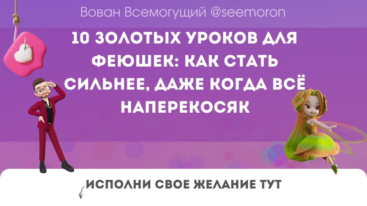 Привет-привет, мои волшебные феюшки! Сегодня я хочу поделиться с вами самыми важными уроками, которые помогут вам обрести силу даже в самые сложные моменты. Мы все — как светлячки, которые светят даже в самой кромешной тьме. И эти уроки — как маленькие фонарики, которые помогут осветить ваш путь к радости, свободе и счастью. Ну что, поехали? Понимаю, это звучит как фраза из плаката 90-х, но факт остаётся фактом: изменить можно только то, что ты сначала примешь. Прими этот мир со всеми его тараканами — и только потом приступай к изменениям. А иначе, как же быть феей-волшебницей? — Вован, мир такой сложный и несправедливый. Как его любить?! — Моя волшебница, это как с новыми туфлями: сначала натирают, а потом понимаешь, что это любовь! Прими его, и тебе станет легче двигаться вперёд. Да-да, иногда кажется, что внутренний голос только и делает, что пихает нас в угол. Но в этих сомнениях скрыта мудрость. Прислушайся, они ведь часто показывают, где у тебя слабые места. А значит, дают шанс