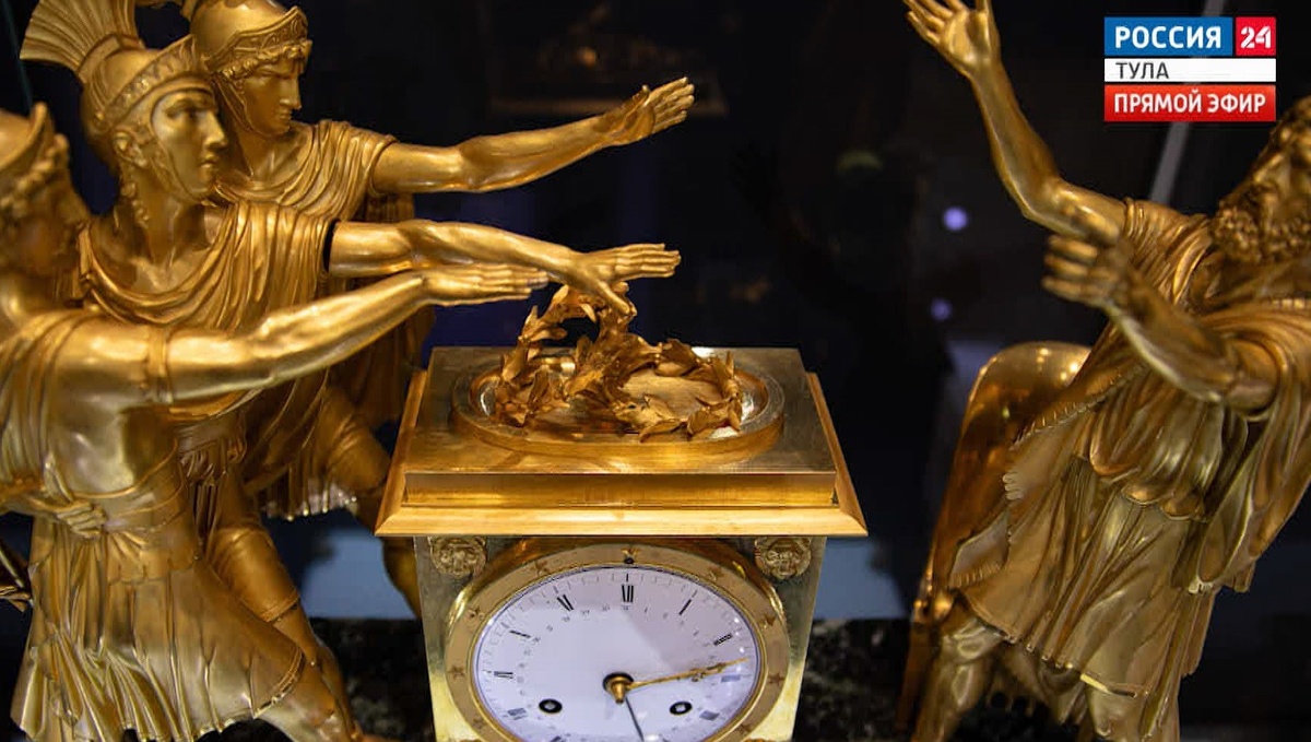 Пётр I на Ладожском озере, герои рыцарских романов, и все это в обрамлении точных механизмов 30 французских каменных часов. На следующей неделе в Тульском филиале ГИМ открывается выставка под названием “Время. История. Миф”. Об этом в прямом эфире Вестей рассказала методист этой выставки Дарья Тамуркина. 30 французских часов. Из каких коллекций? Это ГИМ или это какие-то частные коллекции? Это все из обширной коллекции исторического музея. Всего у нас более 400 экземпляров хранится, но выбрали самые лучшие и подходящие под тему выставки. А что за тема, на что сделали акцент? Прежде всего, хотелось продемонстрировать то, как французские мастера воплощали разные мифологические темы в своих скульптурных, бронзовых композициях, в оформлении часов. Там мы можем встретить исторические сюжеты, которые волновали тогда людей, но и до сих пор актуальны. Давайте немножко поконкретнее, сейчас у нас как раз на экранах фотографии уже смонтированной выставки. Давайте сделаем несколько акцентов. Мы ска