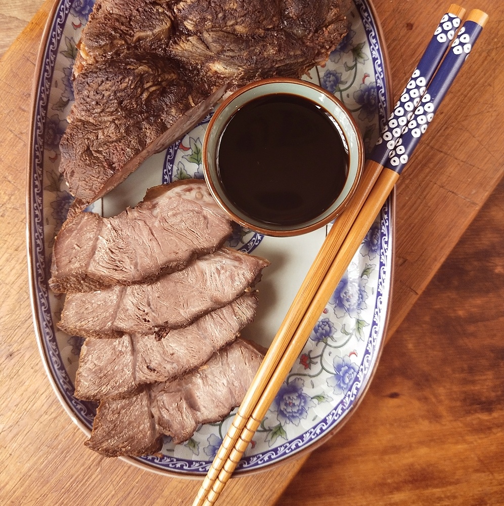 Популярное праздничное блюдо подают нарезанным тонкими ломтиками, как закуску или основное блюдо с рисом или лапшой. 1 кг говяжьей рульки (для этого блюда подходит также свиная рулька и лопатка) Для соуса: 6 ломтиков свежего имбиря (3+3) 4 стебля зеленого лука нарезанных на 3-4 части 4 зубчика чеснока ¼ чашки кулинарного вина «шаосин» ¼ чашки светлого соевого соуса 2 ст.л. темного соевого соуса 1 ст.л. тростникового сахара 2 ст. воды 1 пакетик смеси специй «лу ляо бао» 1 ч.л. соли, если потребуется 1. Подготовить мясо: у говяжьей рульки обрезать соединительные пленки, чтобы не произошло деформации. Свиную лопатку чвернуть рулетом и обвязать или сложить в веревочную сетку. 2. Положить мясо в кастрюлю с половиной имбиря и зеленого лука. Довести до появления серой пены. Слить воду и обмыть кастрюлю и мясо. 3. В кастрюлю снова сложить имбирь, лук, чеснок, мясо. Добавить сахар, кулинарное вино, соевые соусы, и столько воды, чтобы мясо было покрыто на ¾. Довести снова до кипения, положить п