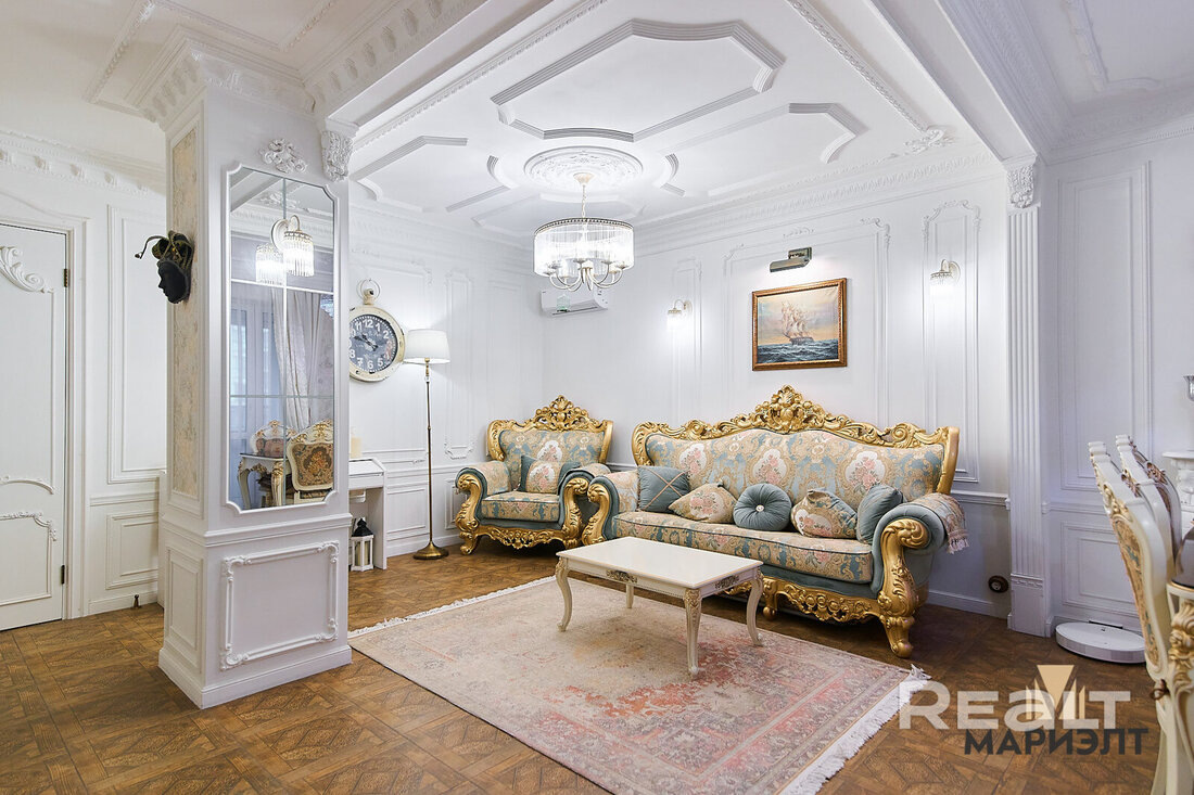 В гостиной стоит мебельный гарнитур, есть телевизор. Интерьер дополняют светильники, картины в золотых рамах и зеркала.