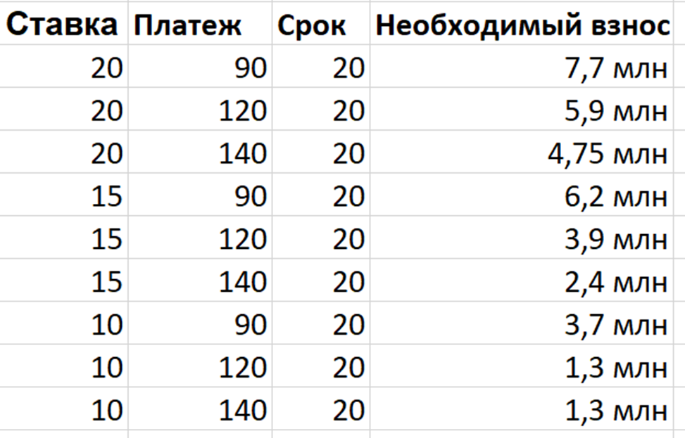Я не рассматриваю вариант ипотеки на 30 лет, при высокой ставке это бессмысленно, при низкой – подозреваю, что захочется закрыть ипотеку побыстрее. Какой-то смысл имеет при ставке в 10%, тогда лишние десять лет ипотеки дадут выигрыш в первоначальном взносе в 1 миллион. Стоит ли 1 миллион десяти лет долгов и переплат? Вообще, зависит от инфляции и актуальных вариантов пристроить деньги под какую-то доходность, я с удовольствием растяну платежи, если за счет этого буду получать бесплатную доходность. Но это всё же сильно оптимистичный вариант, а в идеале мне нужно закрыть все сценарии. Куда деть «лишние» деньги, я, если что, найду)