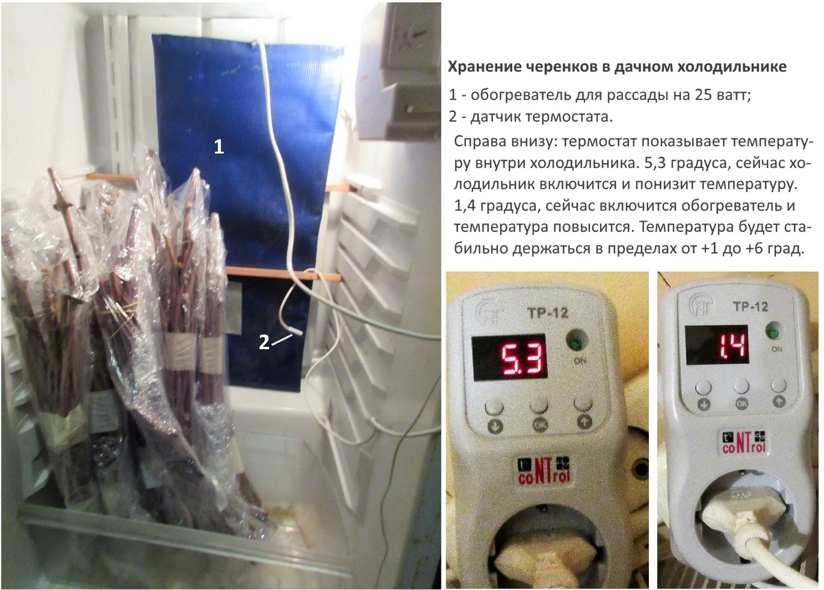 Как лучше сохранить черенки. Этот вопрос задают себе не только виноградари. Известны наилучшие условия для хранения – температура от 0 до +7 градусов, в плотной обмотке политиленовой пленки, для предотвращения испарения влаги. И если черенков несколько штук, проблем нет. Достаточно сверток поместить до весны в домашний холодильник. Но как быть, если виноградник разросся и черенков уже и сотня и больше? Хорошо бы иметь погреб со стабильной температурой. Но таковые есть не у всех. Например, мой погреб в садовом домике, где нет зимнего отопления, промерзает зимой, когда температура опускается ниже -10 градусов. Можно свертки с черенками прикопать в почву, чтобы их укрыл снег. Но когда в марте наступает пора окоренения, снег ещё не сошел. И поверхность почвы, часто, промерзшая в ледяную корку. Вот бы оставить черенки в дачном холодильнике, который зимой не у дел и пустует. Но тут другая проблема. Температура может опуститься ниже критической и почки погибнут. И я нашел выход. В холодильник