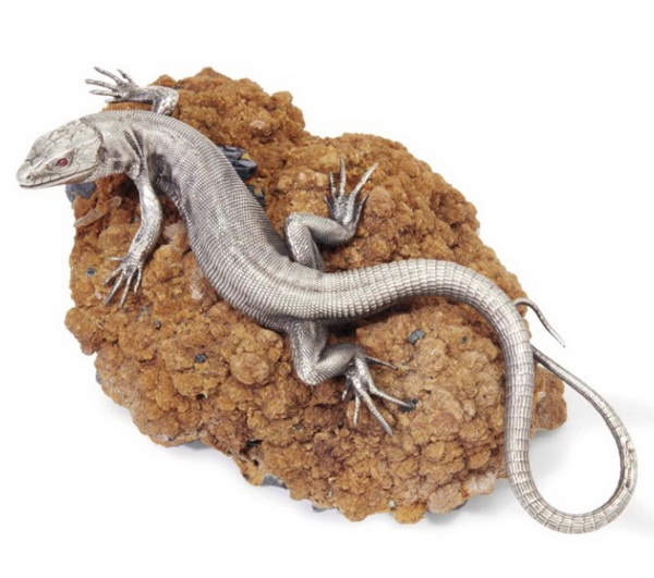 Пресс-папье в виде серебряной ящерицы с рубиновыми глазами на подставке из породы с кристаллами пирита, длина 18 см, мастерская Виктора Аарне, фирма Фаберже, Санкт-Петербург, 1899-1904 гг.