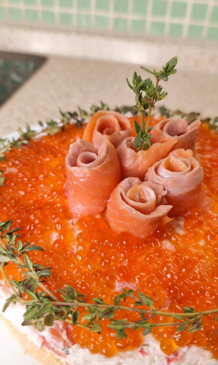 Чизкейк отлично подойдет для подачи на любой праздник, а особенно на Новый Год! Давайте его вместе с вами скорее приготовим! Для начала измельчаем несоленый крекер в мелкую крошку. Влейте пожалуйста растопленное сливочное масло к крекерам и хорошенько перемешиваем в однородную массу Хорошо утрамбовываем и убираем форму в холодильник на один час Для начинки шинкуем снежного краба И нарезаем соленую рыбку, возьмите какая вам больше всего нравится И добавляем творожный сыр Объединяем все продукты в одну массу Вкуснейшую начинку выкладываем на песочную основу и убираем в холодильник на два часа Украсьте чизкейк розочками из рыбки! И сделайте самую шикарную шапочку из красной икры! И сверху украсим веточками тимьяна или розмарина! Вот такая для Вас красота! Всем приятного аппетита! Спасибо вам, что дочитали и поставили лайк. Это большая благодарность за нашу работу. Мы будем очень признательны обратной связи и вашим комментариям! А Вы подписались, нет? Тогда мы приедем к Вам сами, накормим