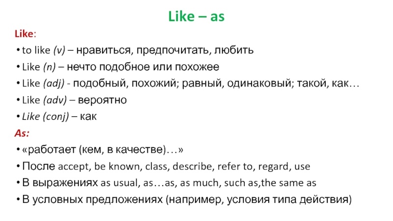 Оба слова — "like" и "as" — могут быть переведены как "как", но их использование зависит от контекста, и они выполняют разные грамматические функции. Давайте рассмотрим, чем они отличаются.