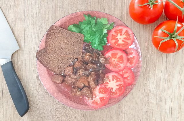 А теперь давайте посчитаем, всё на мою порцию - это 200 грамм тушёной говядины в готовом виде, 10 грамм кинзы свежей, 2 ломтика хлеба, 130 грамм свежих томатов. В итоге плюс - минус получится: