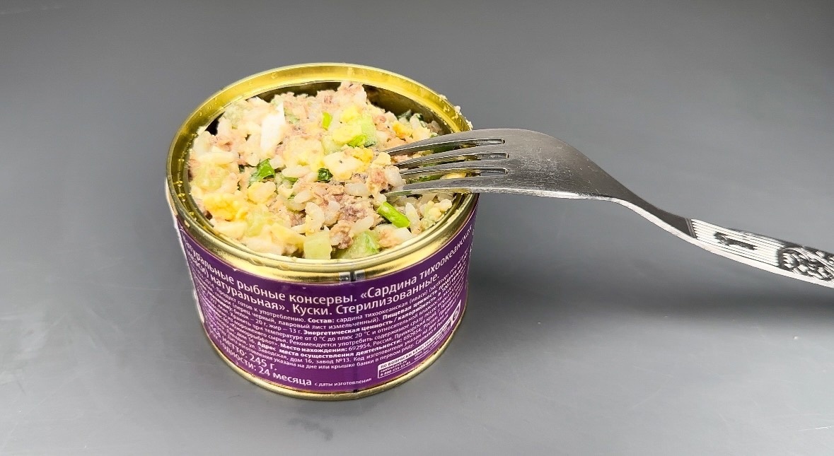 Приготовление этого салата занимает всего несколько минут, если заранее приготовить продукты, а результат поражает своим вкусом и ароматом. Мы начинаем с основного ингредиента — рыбных консервов. Горбуша, сардина или сайра — выбирайте по своему вкусу.