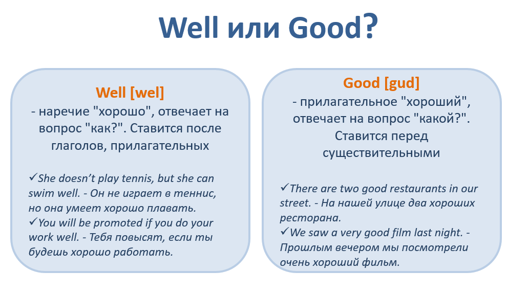 В английском языке "good" и "well" — это два слова, которые часто путают, потому что оба могут означать что-то положительное. Однако, несмотря на то, что они имеют схожее значение, их использование зависит от контекста, поскольку одно из них — это прилагательное, а другое — наречие. Давайте разберемся, как и когда правильно использовать каждое из этих слов.