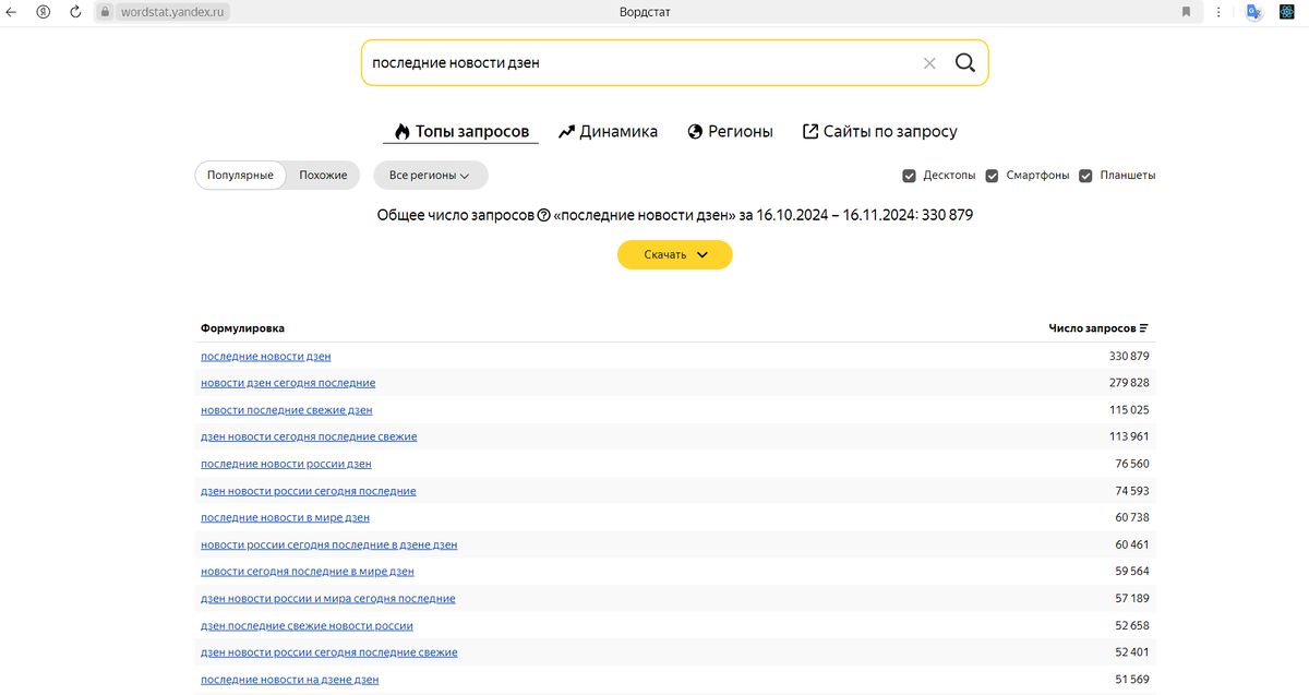 В качестве жирных высокочастотных ключей взял: 1) "Последние новости Дзен" 2) "Технология" и 3) "Яндекс Дзен".