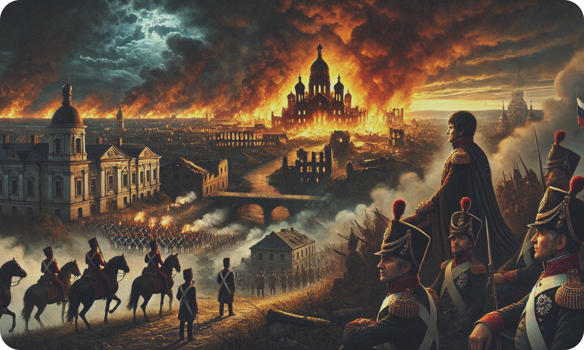 В реальной истории Наполеон действительно захватил Москву в сентябре 1812 года, надеясь, что падение города заставит русского императора согласиться на мир. Но Александр I проявил необычайное упорство, отказавшись вести переговоры, несмотря на разрушение Москвы и тяжелые потери российской армии. Наполеон был вынужден провести несколько недель в пустой и сожженной Москве, ожидая реакции русского царя. В конце концов, из-за нехватки продовольствия и суровой русской зимы, Гранд Армия начала своё знаменитое и трагическое отступление, приведшее к поражению Франции в войне.