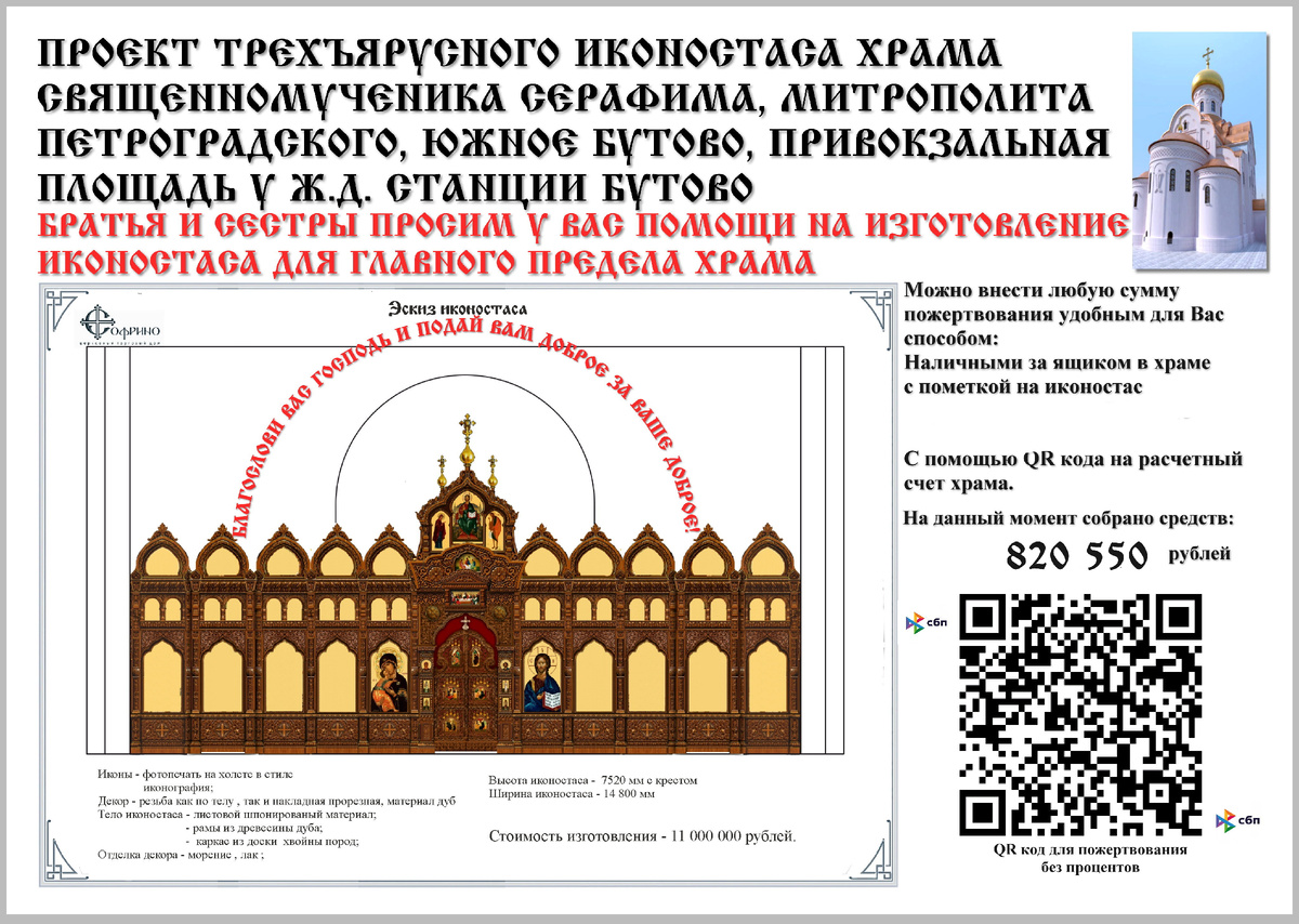 Дорогие Братья и Сестры, прихожане храма священномученика Серафима, жители района Южное Бутово, почитатели памяти священномученика Серафима и преподобного Серафима Саровского! Обращаемся к Вам с просьбой помочь нам собрать денежные средства для изготовления иконостаса в главный придел храма. Стоимость иконостаса 11 000 000 рублей. В настоящее время мы уже собрали 498 500 рублей но этого не достаточно чтобы подписать договор и начать изготовление, на первый этап для подписания договора требуется авансовое перечесление средств в ХПП Софрино — 3 000 000 рублей. Просим Вас оказать посильную помощь. ИЗГОТОВЛЕНИЕ ИКОНОСТАСА 8 МЕСЯЦЕВ. Можно внести пожертвование удобным для Вас способом: Наличными за ящиком храма с пометкой на иконостас Переводом на карту сбер с пометкой на иконостас 8-985-183-75-94 Максим Алексеевич Г. По QR коду нарасчетный счет храма СБП без комиссий ТАКЖЕ В ХРАМЕ МОЖНО РАСПЕЧАТАТЬ ИЛИ ВЗЯТЬ БЛАГОДАРСТВЕННЫЕ СЕРТИФИКАТЫ ДЛЯ ПОЖЕРТВОВАНИЯ ПО QR-коду, СЕРТИФИКАТЫ ХРАНЯТСЯ
