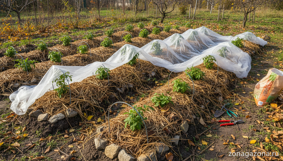 Осень – прекрасное время для посадки плодовых деревьев, ягодных и декоративных кустарников. Опытные садоводы советуют сажать растения под зиму, когда прекращается сокодвижение, корневой системе не приходится тратить силы на обеспечение листьев, веток влагой, питательными компонентами. Успех зависит от соблюдения многих условий посадки: глубины ямы, внесения удобрений, обильного полива, мульчирования. Но не каждое молодое деревце или кустик способно пережить суровые условия зимы. Укрытие саженцев поможет сохранить их в целости, обеспечит защиту от холодов, обжигающего воздействия солнечных лучей, нападок грызунов, зайцев. В этой статье мы расскажем о правилах подготовки посадок к зимнему периоду. Мы живем в зоне рискованного земледелия. Температура воздуха зимой может опускаться до 20 градусов, а устойчивый снежный покров, который мог бы защитить растения, далеко не всегда устанавливается на несколько месяцев. Сильные ветра, обжигающее солнце, обледенение после оттепелей – все это созда