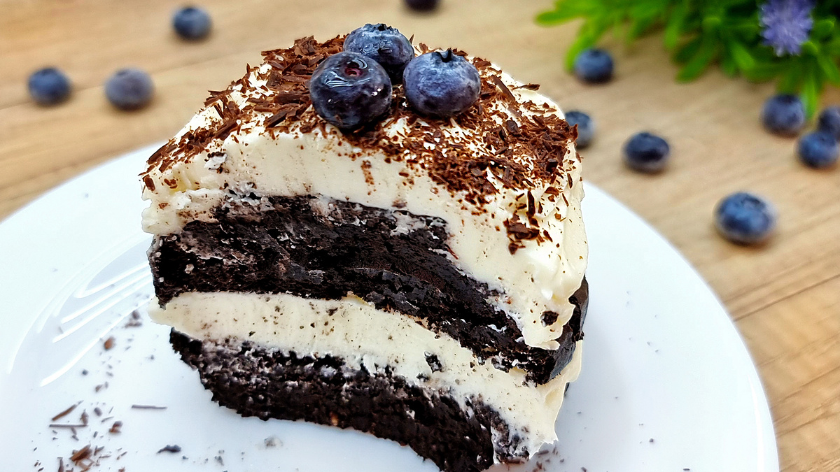 Очень вкусный торт! Готовится легко и быстро. Минимум ингредиентов - максимум удовольствия! Легкий и полезный десерт. Правильно питаться - это круто! Ингредиенты: 1 спелый банан; 1 яйцо; щепотка соли; 30 г какао; 1/3 чайной ложки разрыхлителя; 130 г сливочного сыра + 1 столовая ложка меда; можно украсить шоколадом