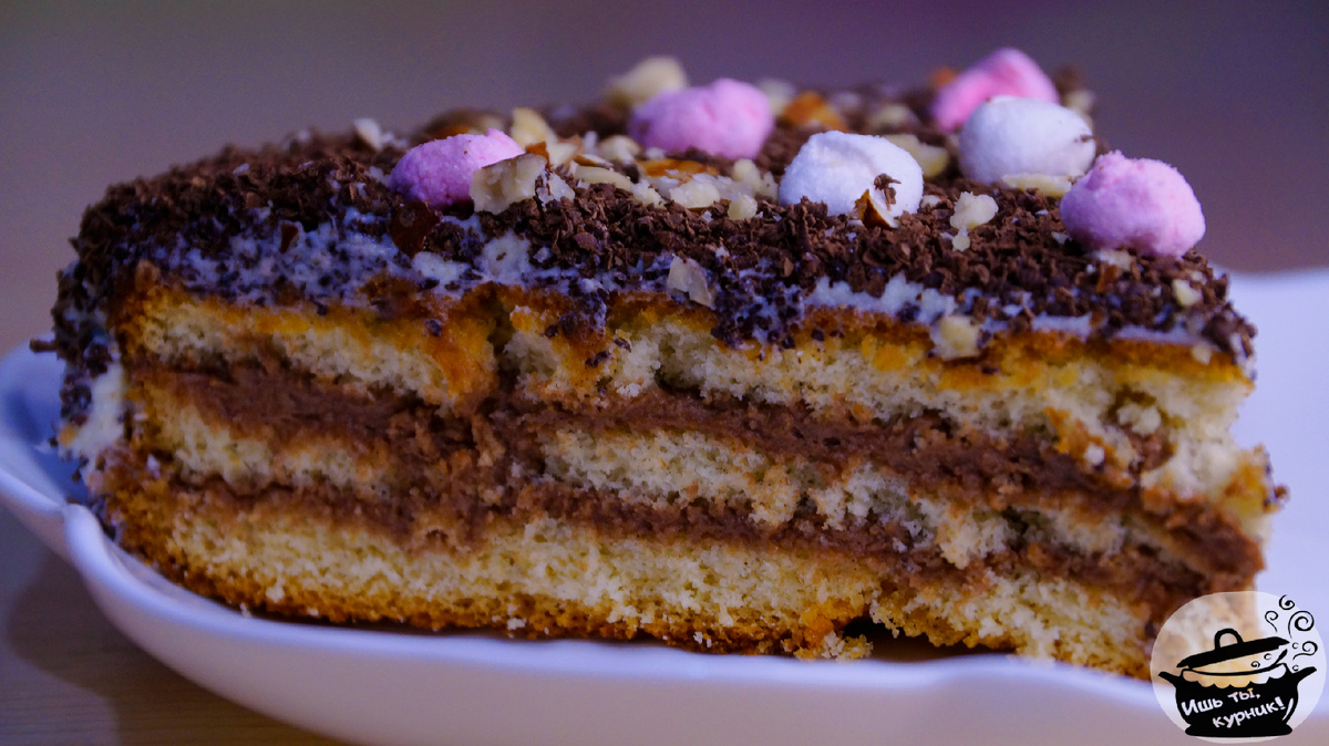 Ингредиенты: Приготовление: Отделить белки от желтков. Взбить желтки до увеличения в объёме и побеления, белки до устойчивых пиков. Вбить в белки сахарную пудру, мёд и желтки и продолжать взбивать до однородности. В несколько этапов ввести просеянную муку и перемешать лопаткой. Выпекать 20 – 30 минут при температуре 175 – 180°C в предварительно разогретой духовке. Готовность проверить деревянной шпажкой (шпажка должна выходить сухой). После выпечки остудить и разрезать на 3 коржа. Натереть шоколад на мелкой тёрке. Масло комнатной температуры объединить со сгущённым молоком и взбить. Полученную массу разделить на 2 равные части, добавить в одну из них какао и ещё раз взбить миксером до однородности. Выложить коржи друг на друга, промазывая кремом с какао. Сверху покрыть торт кремом без какао и посыпать тёртым шоколадом. Украсить орехами и маршмеллоу по вкусу и убрать в холодильник на несколько часов. Приятного аппетита!