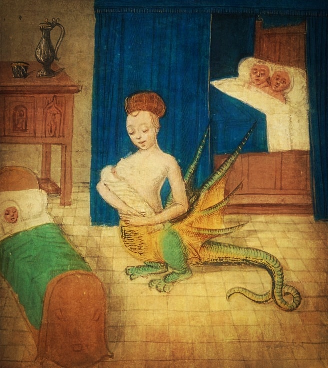 Легенда начинается с короля Элинаса. Во время охоты он ушёл глубоко в лес и встретил изумительной красоты девушку. Звали её Прессина. Элинас влюбился в неё с первого взгляда и это не удивительно, ведь это была не простая девушка, а самая настоящая фея. Король тут же встал на колено и предложил Прессине стать королевой. Фея согласилась, но поставила два условия: Условия показались королю ерундовыми и он согласился. Время шло и вскоре девушка родила королю трёх дочерей. Но не сдержал Элинас обещания зайдя в спальню в запретный момент. Прессина разочаровалась в супруге и, забрав детей, поселилась на острове Авалон. Вскоре девочки подросли и задались вопросом - а что они тут вообще делают? Почему их мать бросила мужа и поселилась на этом забытом всеми острове? Прессина ответила на все вопросы. Тогда одна из дочерей, Мелюзина уговорила сестёр отомстить отцу-обманщику. Они напали на него, связали и заточили в недрах горы. Довольные собой девочки пошли хвастаться матери, но Прессина не оценил