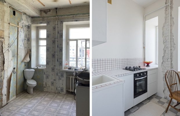 В результате небольшой перепланировки в квартире есть отдельная кухня, гостиная, спальня, прихожая и совмещенный санузел. Для отделки стен в кухне использовали моющуюся матовую краску светлого оттенка, на полу — керамогранит. Чтобы освободить газовую трубу, пришлось дробить отделку. После ее демонтажа стену оставили в таком виде и заколеровали открывшийся кирпич белым. Таким образом простенок стал своеобразным акцентом, который сразу притягивает внимание.