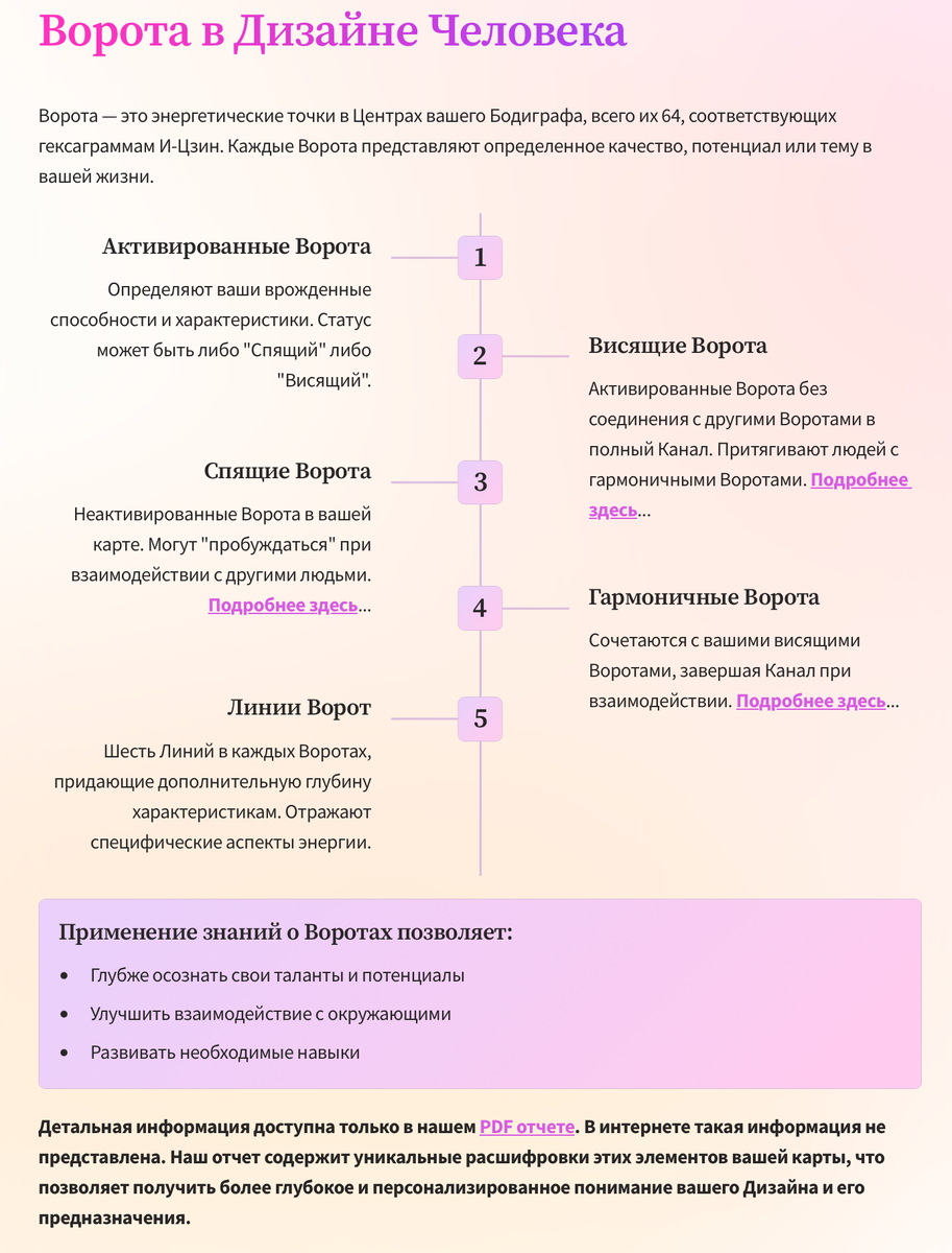 Что такое Ворота? Ворота в Дизайне Человека — это энергетические точки в Центрах вашего Бодиграфа, всего их 64, соответствующих 64 гексаграммам И-Цзин. Каждый Ворота представляет определенное качество, потенциал или тему, которые могут проявляться в вашей жизни. Ворота показывают специфические черты личности и таланты, которыми вы обладаете или которые могут быть активированы при определенных обстоятельствах. Активированные Ворота — это все Ворота, которые есть в вашей карте Дизайна Человека. Они определяют ваши врожденные способности и характеристики, которые вы можете проявлять в повседневной жизни. Но всегда нужно учитывать статус Ворот. Статус может быть либо "Спящий" либо "Висящий". Расшифровывать собственные ворота в отдельности от статуса это бесполезная затея уводящая по неправильному пути. Висящие Ворота — это активированные Ворота, которые не соединены с другими Воротами в полный Канал. Они словно "висят" на одном конце Канала. Висящие Ворота проявляют свои качества, но им мо