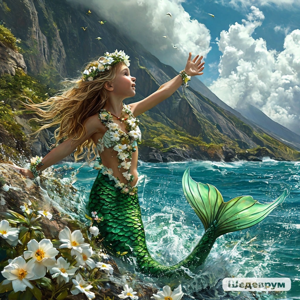 Я предложила представить ей что мы русалки с красивыми чешуйчатыми хвостами, переливающиеся темно-зеленым цветом. Девочка пришла в восторг от этой идеи. И вместо ног у нас появились хвосты. Я предложила показать ей ту жизнь, где я помнила себя в воплощении русалкой. Мы нырнули поглубже и доплыли до подводных скал где было круглое отверстие как портал, занырнув в него мы ощутились в небольшом заливе возле красивого водопада. «Как же тут сказочно красиво!» - воскликнула девочка. Ее глаза искрились и блестели! «А чем мы занимались в той жизни?» - Поинтересовалась девочка. Я показала что на дне морском есть раковины, внутри которых находятся перламутровые жемчужины. Мы добывали их и складывали в небольшие круги! «Как красиво они смотрелись бы на руке,» - подумала девочка и заметила небольшую стаю дельфинов! Знакомый ей розовый дельфин позвал ее в путь, и подарил необычное ожерелье из белых цветков плюмерии и кристаллов! Этот цветок ещё называли белой звездой. Ожерелье напоминало гавайское традиционное приветственное украшение, которое дарят как символ любви. Девочка была в восторге! Надев ожерелье на себя мы все оправились в путь! Неподалеку от нас плыли дельфины. Мы следовали за их вожаком, розовым дельфином. Уже смеркалось, когда мы доплыли до тайного, но какого-то знакомого, острова! Это были земли Гавайи - тропический рай, где мать-природа постаралась особенно с любовью! На острове был пробужденный вулкан. Девочка вынырнула и увидела людей с похожими на ее ожерелье но без кристаллов. Дельфин сказал что ей придётся выйти на сушу и вновь обрести человеческие ноги. «Но для чего?» - Спросила девочка. «Что мне там делать?» И тут слево, на темном небе появилось крылатое существо с острыми когтями и длинным тонким хвостом. Крылья его напоминали кожаные и жилистые тонкие крылья летучей мыши. Он направился вверх к горе, наводя ужас на местных жителей и сея мрак и черный туман. Девочка уже стояла на золотистом песчаном берегу, шевеля своими пальцами на ногах и ощущая тепло и как песчинки рассыпаются сквозь пальчики. Необычные ощущения когда чувствуешь под ногами землю, а не воду. Девочка следовала импульсам своего сердца! Она начала забираться на высокую гору, которая словно поделилась на две половины тёмную и светлую. Подниматься выше становилось все сложнее и сложнее. Порывистый ветер то обжигал, то обдавал сильным холодом. Дорога была каменистая и скользкая, а на обрывах был велик риск оступиться и упасть вниз. Девочку охватывал страх, который шёл с макушки ее головы и вниз к ногам и одновременно из сердца выходило чувство смелости, которое расширялось во все стороны, создавая мощный энергетический щит и кокон вокруг нее! Временами на нее накатывало чувство бессилия перед испытаниями и стихиями, а иногда силы появлялись словно из неоткуда, давая возможно продолжать свой сложный путь! Девочка не знала что требуются ей сделать, и для чего она идёт вверх! Но словно слышала зов души, что ей нужно к сердцу горы, на самую верхушку. Нужно помочь этому вулкану обрести баланс и уравновесить силы. Чернота распространялась все больше, поглощая всю территорию у подножия горы. Но девочка отчаянно шла дальше. Она чувствовала что не одна. Ее поддерживают высшие силы и помощники с тонкого плана, направляя ей светлые лучи высоких вибраций! Это предавало ей 